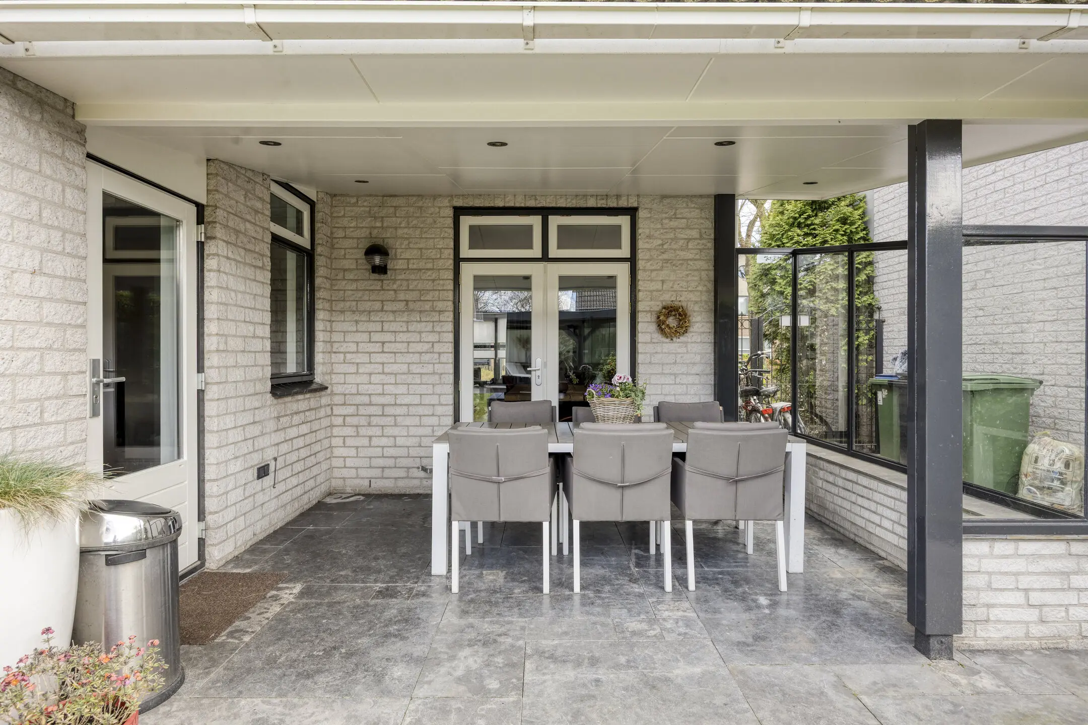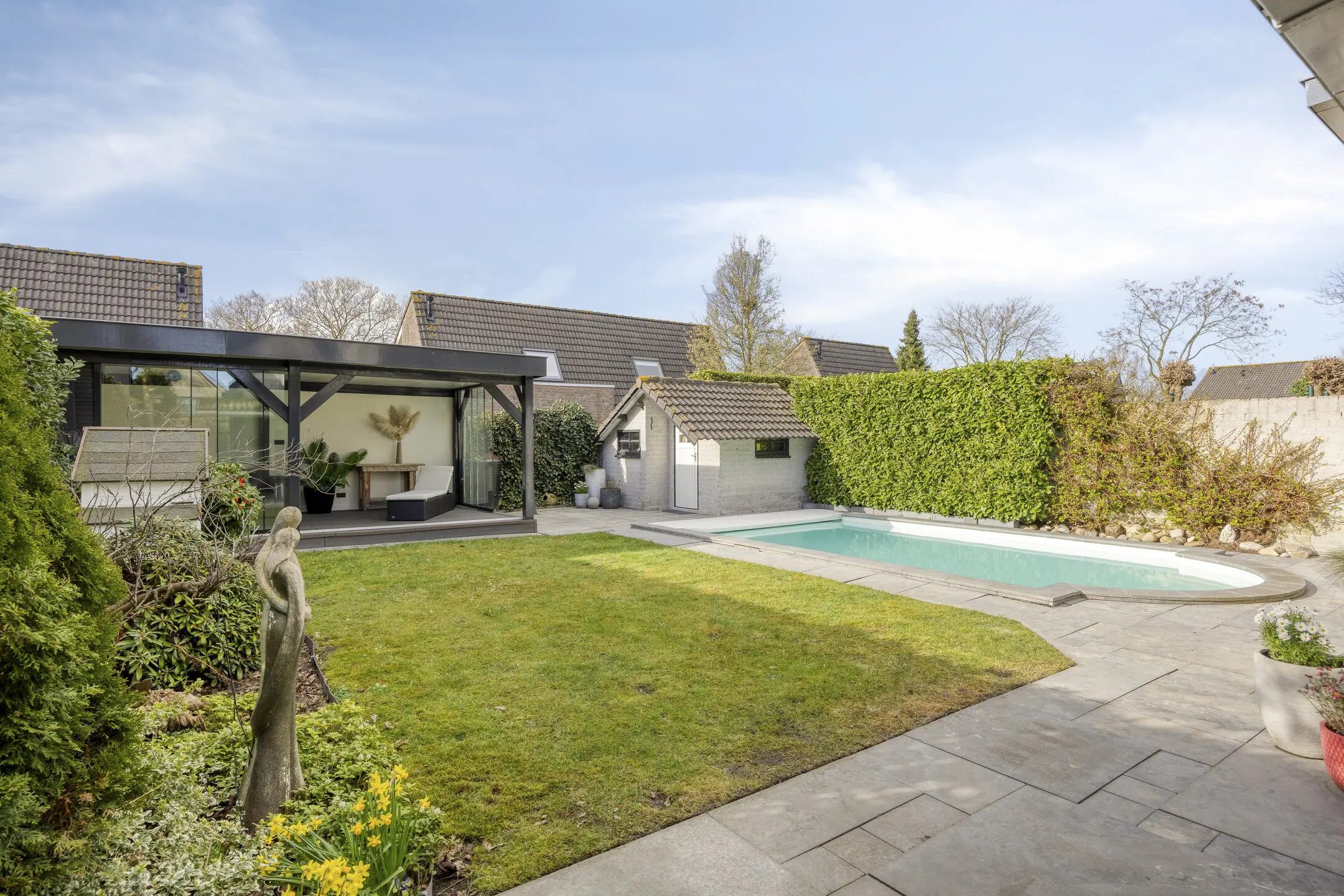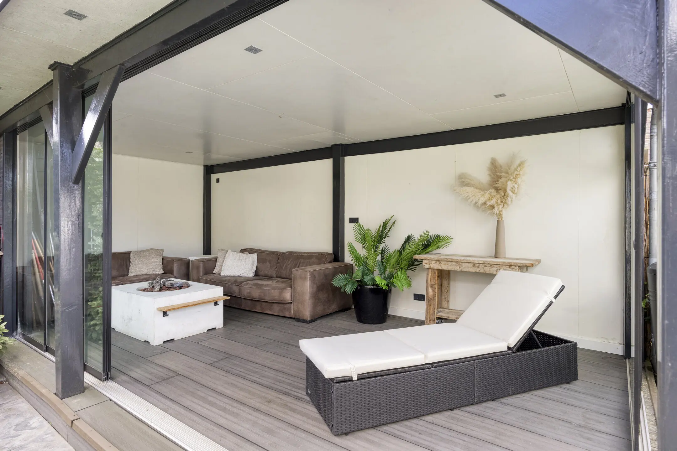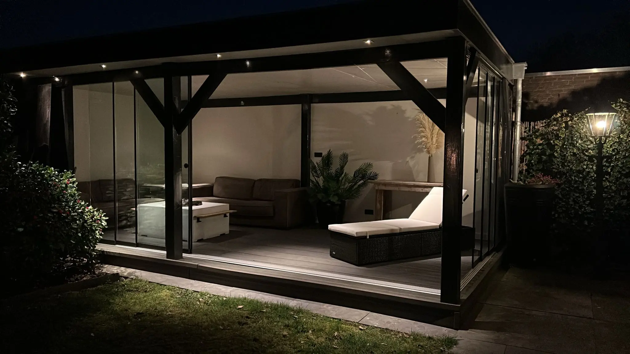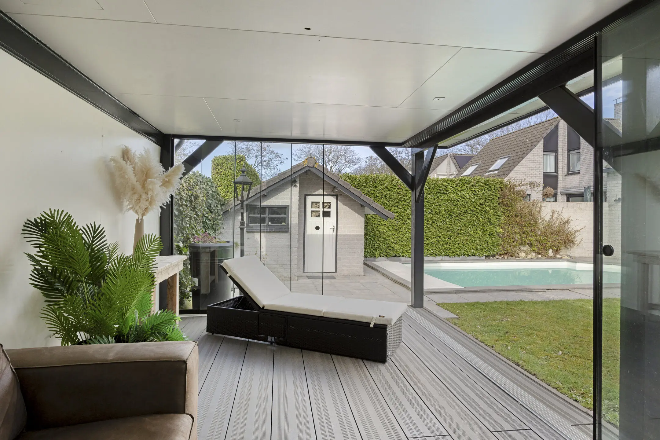 • Royale overkapping met glazen schuifwanden – Een extra buitenkamer waar je vrijwel het hele jaar kunt genieten