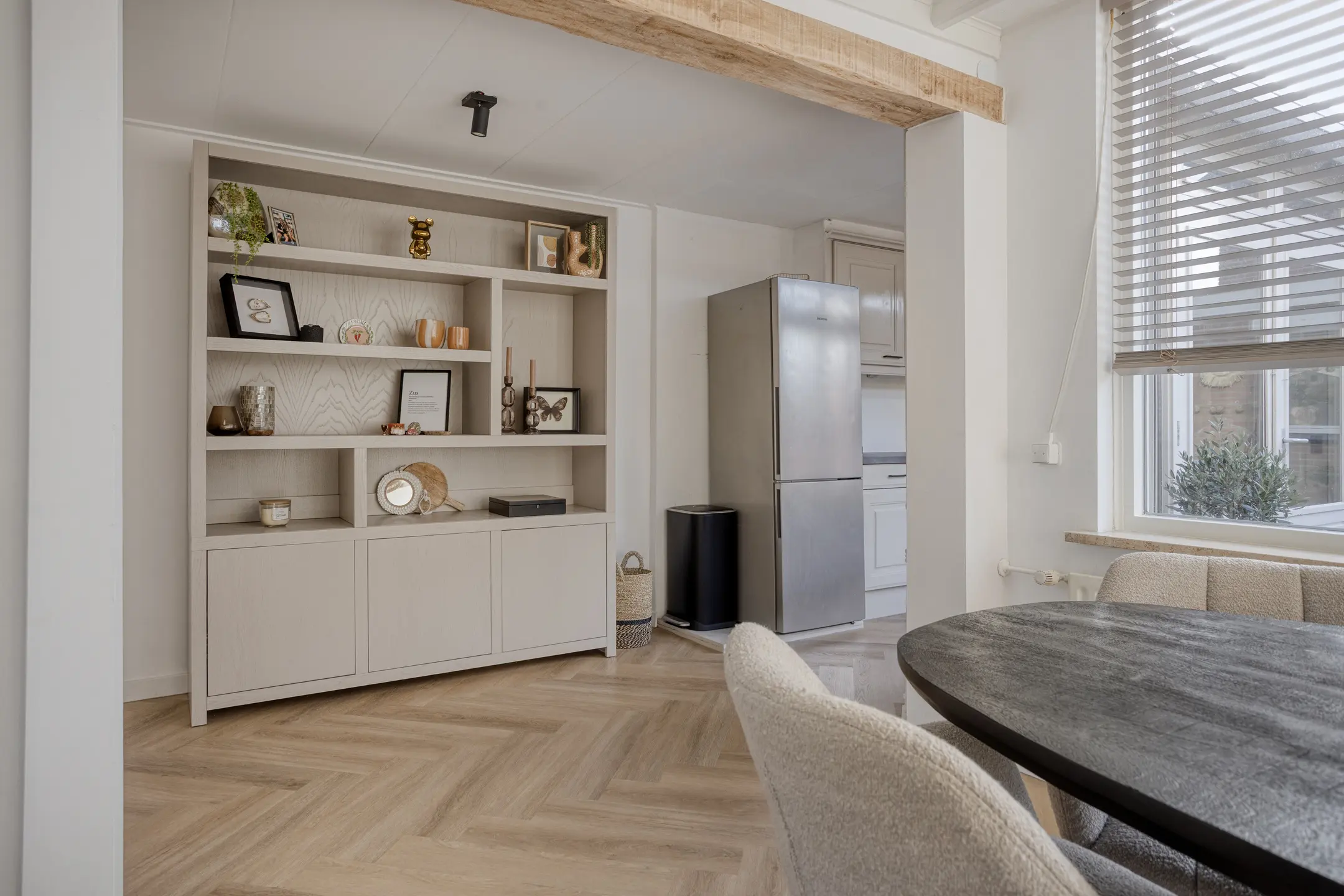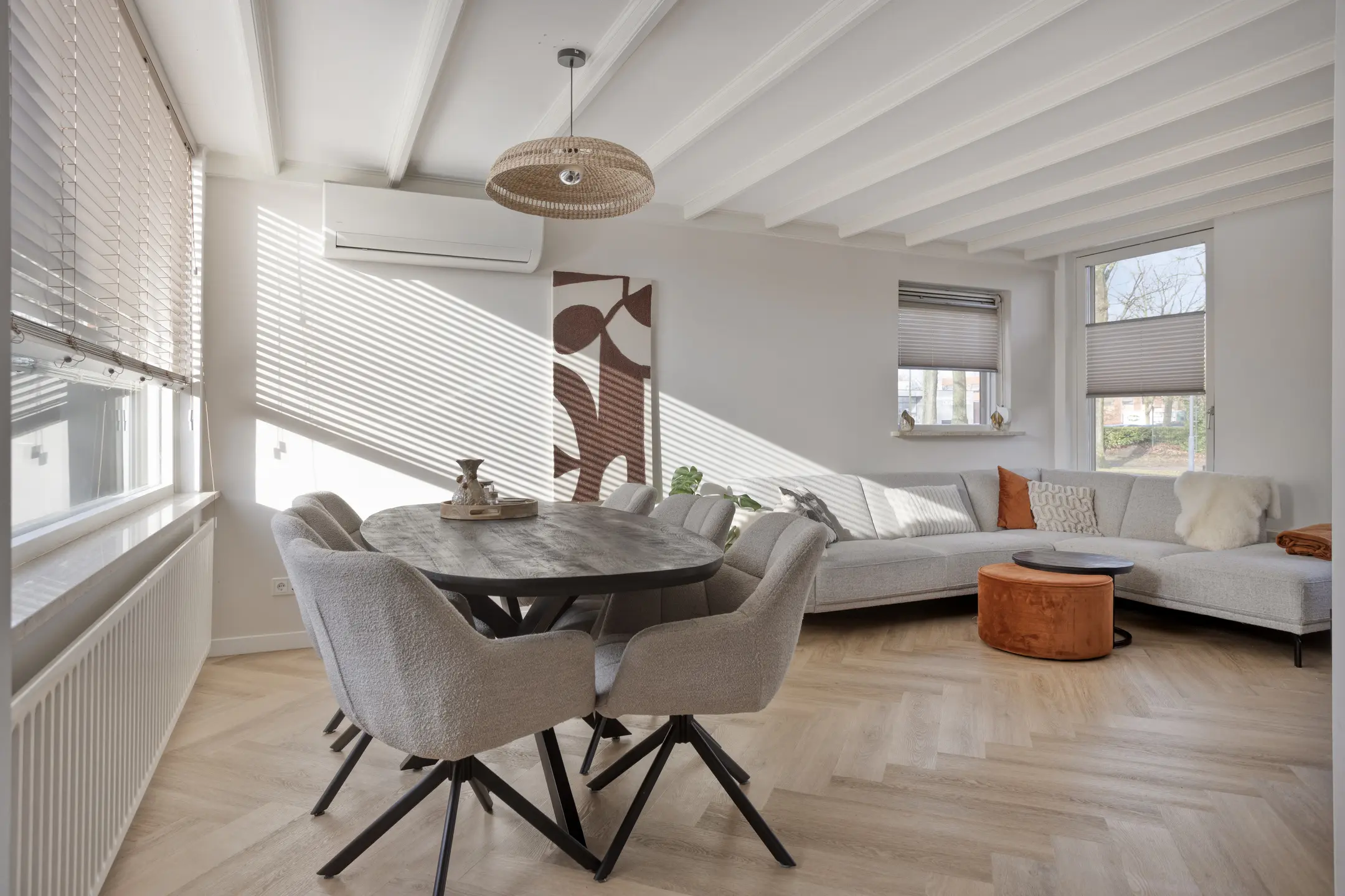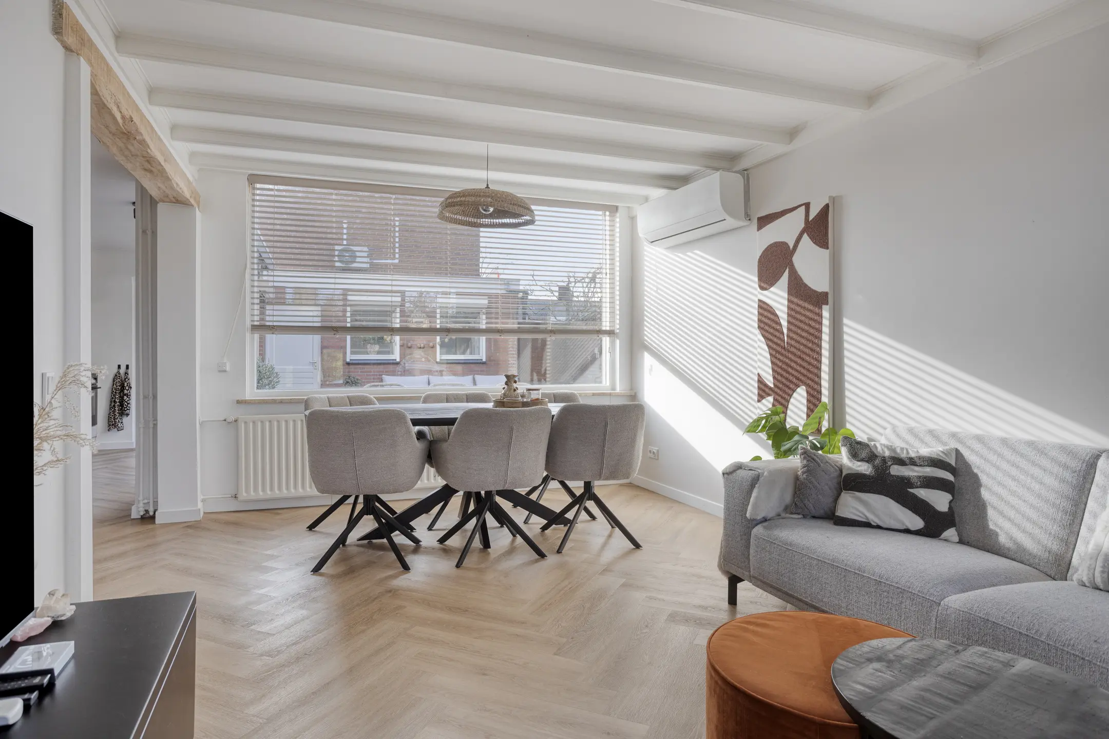 • Lichte woonkamer met airco en een nieuwe PVC-visgraadvloer (2024) die de ruimte een rustige uitstraling geeft.