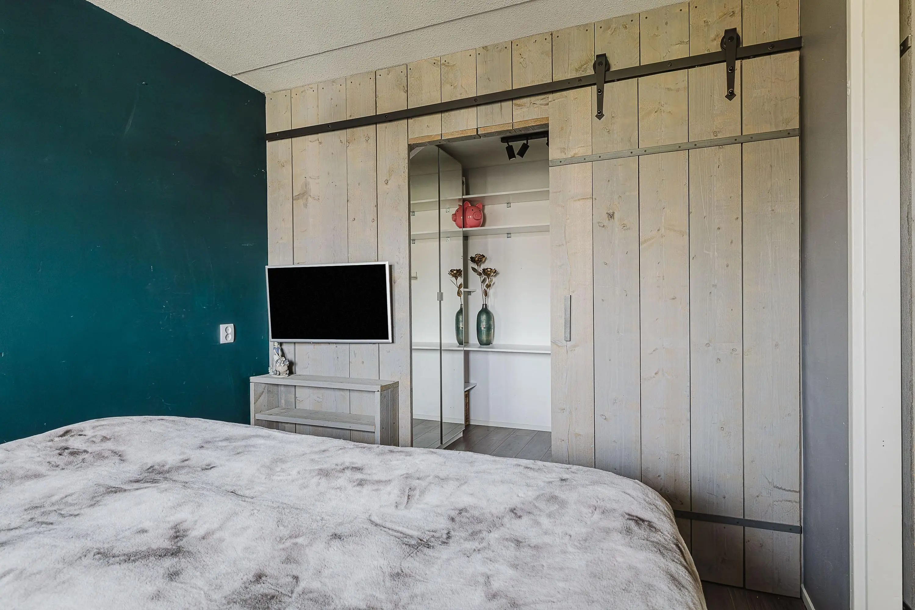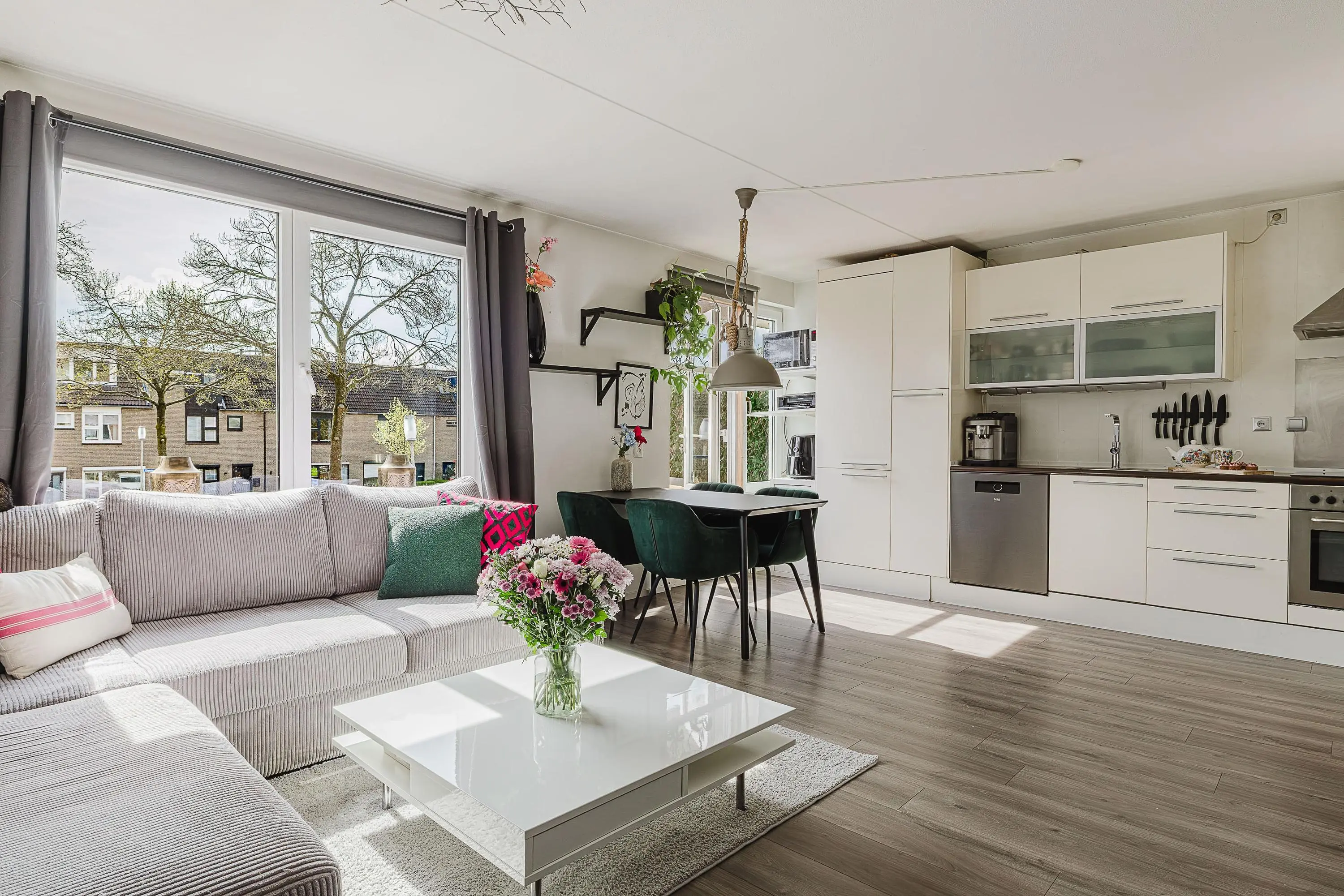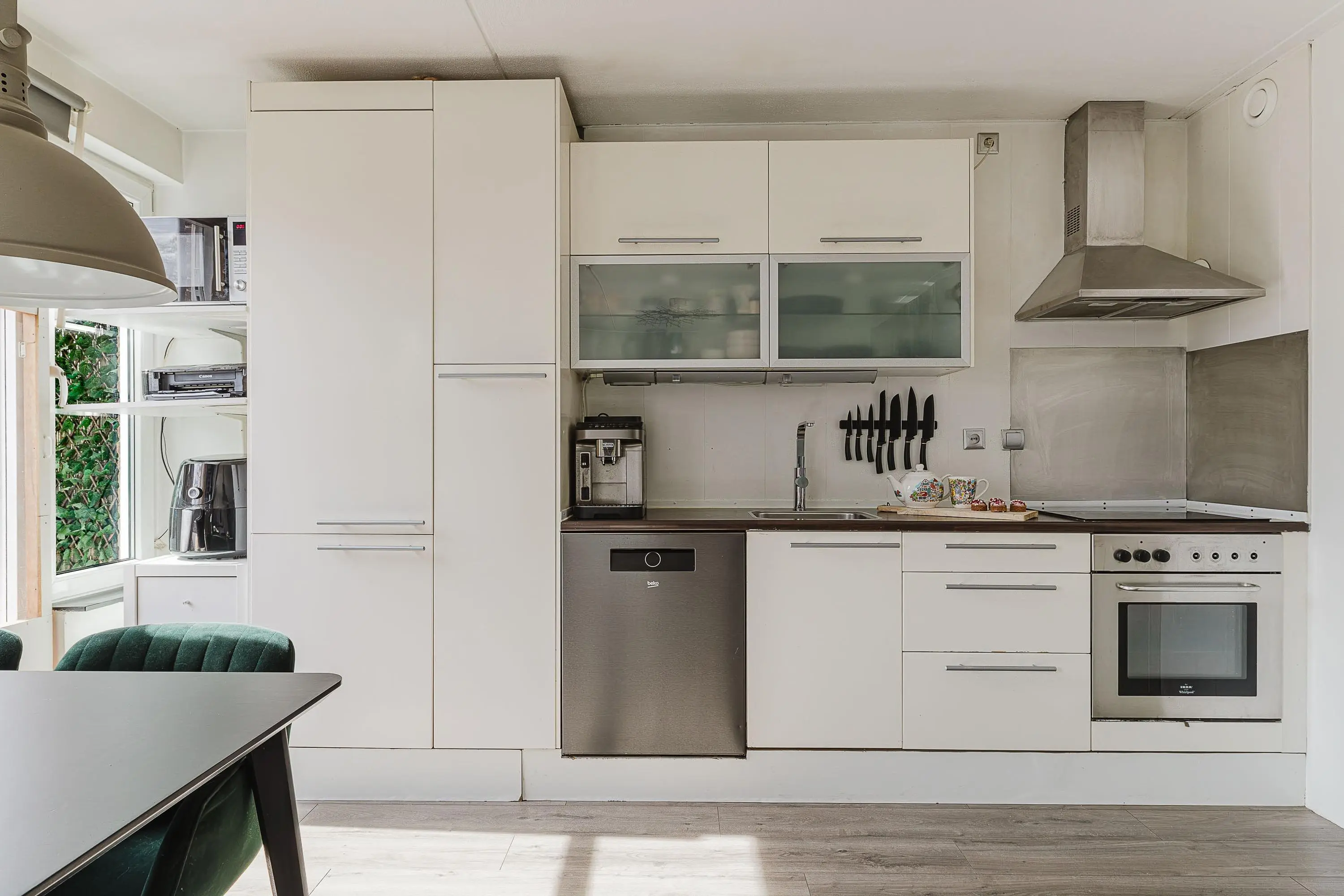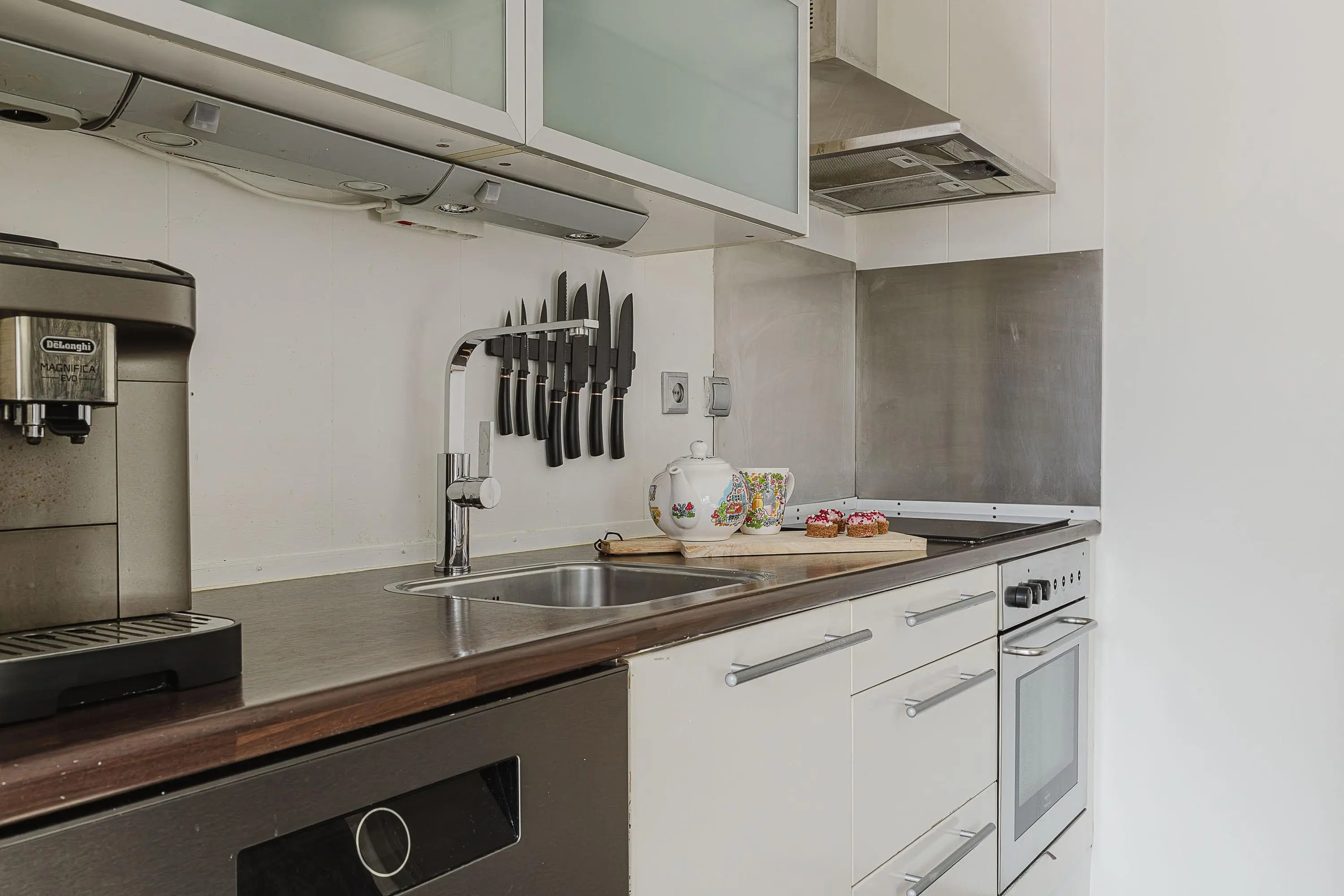 Via de afgesloten galerij kom je bij het appartement op de eerste verdieping. In de hal bevinden zich de meterkast en een bergkast. De slaapkamer is v.v. een ruime inloopkast met een bureau. De badkamer is v.v. een bubbelbad met hand- en regendouche, hangend closet, wastafelmeubel en wasmachine-aansluiting. De woonkamer en open keuken hebben door de grote raampartijen een weldadige lichtinval. De keuken is uitgerust met vaatwasser (2023), inductie-kookplaat (2022), koel-vriescombinatie, oven en een enkele spoelbak met rvs kraan.
