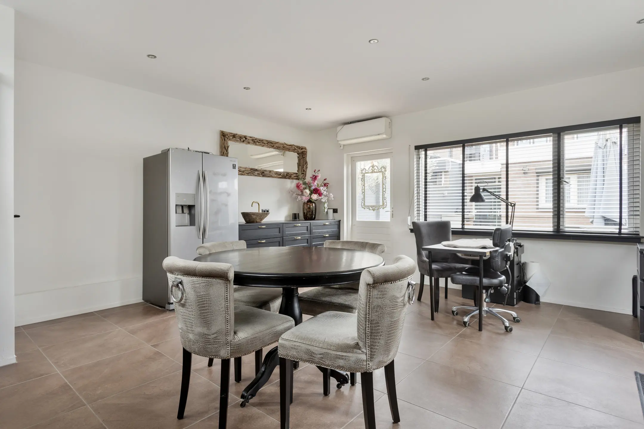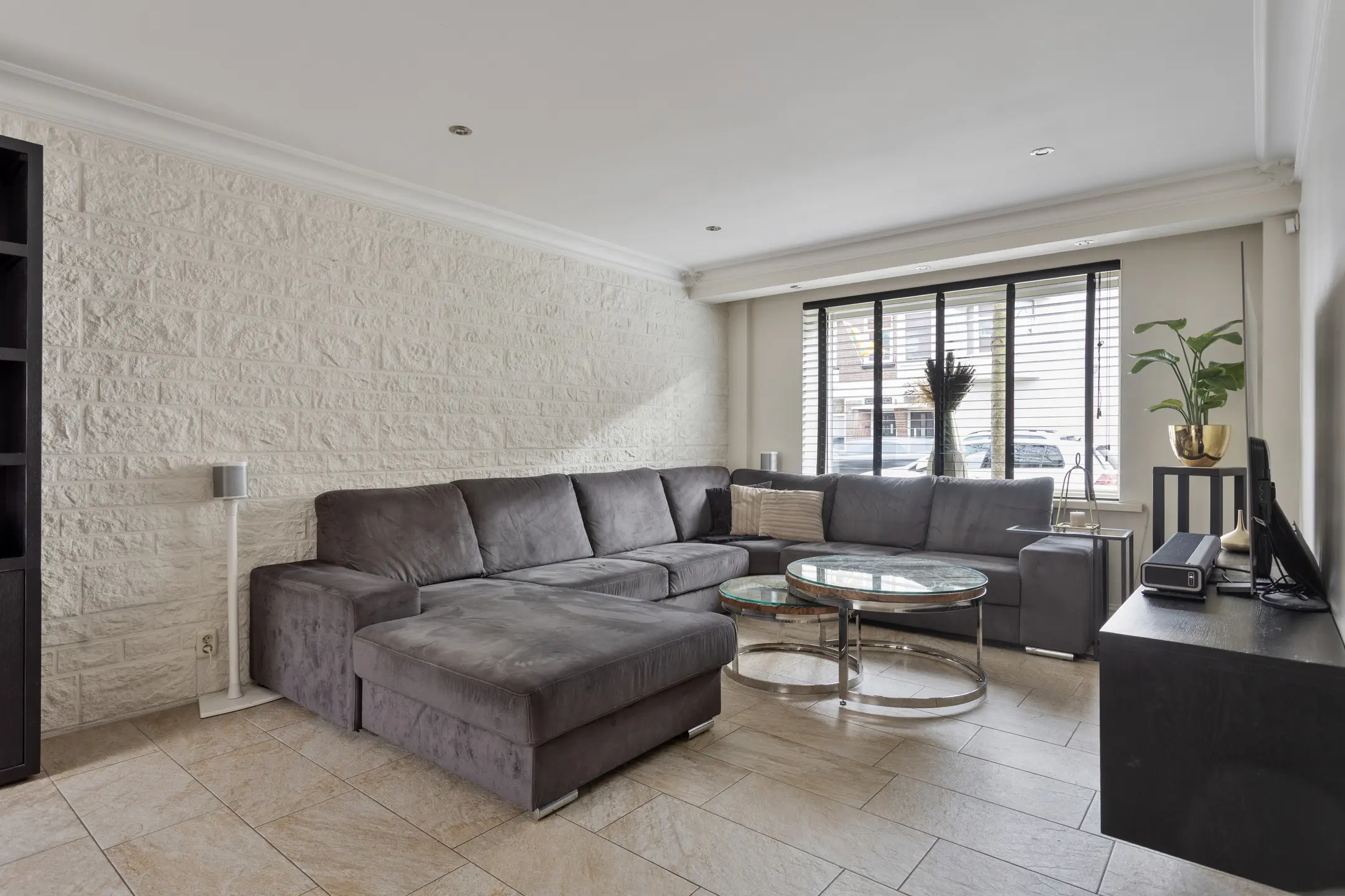 De woonkamer is ruim, licht en comfortabel. De lichte muren en lichte tegelvloer met vloerverwarming vormen een rustige basis. Grote raampartijen en openslaande deuren aan de achterzijde laten het daglicht rijkelijk binnenstromen en verbinden binnen moeiteloos met buiten. Dankzij de airconditioning is het hier in elk seizoen aangenaam verblijven.