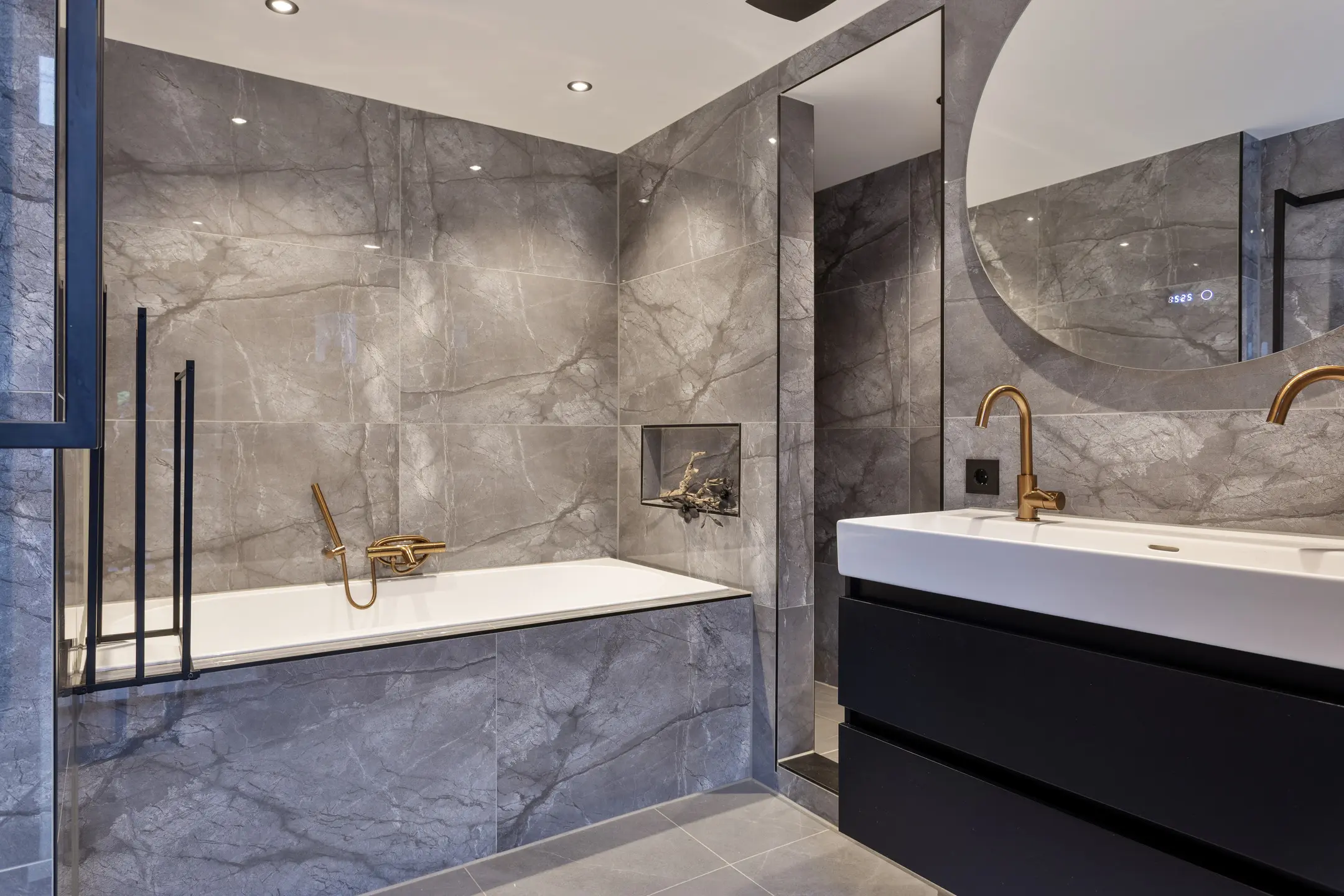 Via de keuken bereikt u het moderne toilet en de luxe badkamer, beide gelegen op de begane grond. De badkamer is in 2025 vernieuwd en straalt hotelgevoel uit dankzij de marmerlook tegels en goudkleurige kranen. Hier geniet u van een ligbad, een ruime inloopdouche en een stijlvol wastafelmeubel.