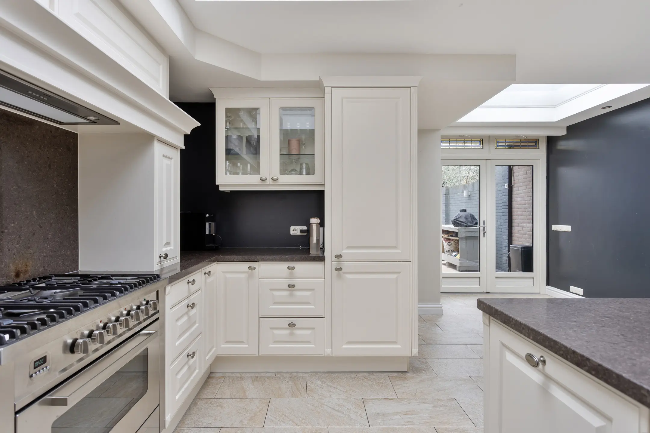Aansluitend loopt u de woonkeuken in – een ruimte die direct indruk maakt. De lichtkoepel zorgt voor extra veel daglicht en versterkt het open karakter. De keuken is uitgevoerd in een lichte opstelling met een stijlvol stenen werkblad. Het prachtige fornuis is een echte eyecatcher en maakt koken hier tot een beleving. Aan de bar is plek om gezellig aan te schuiven voor een ontbijt of een glas wijn terwijl er gekookt wordt. Uiteraard is de keuken voorzien van een koelkast, vaatwasser en een Cooker voor direct kokend water.