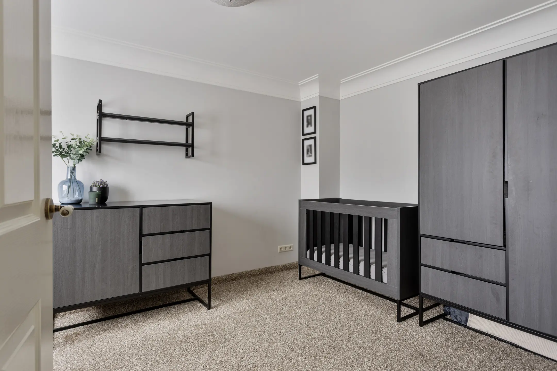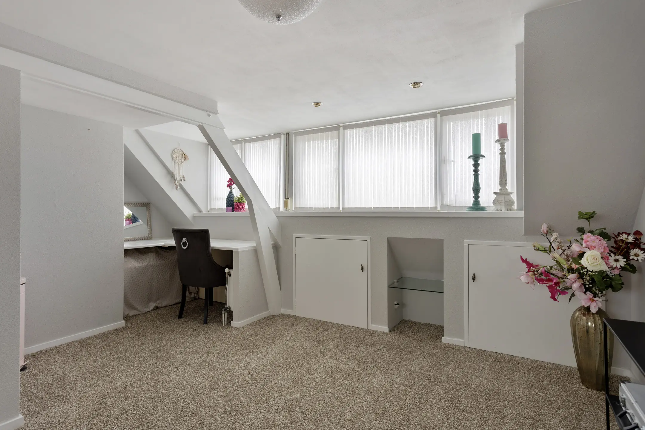De trap brengt u naar de overloop van de eerste verdieping, voorzien van vloerbedekking die doorloopt over zowel de eerste als tweede verdieping en zorgt voor een warme, rustige uitstraling. Op de overloop bevindt zich een praktische trappenkast voor extra bergruimte.