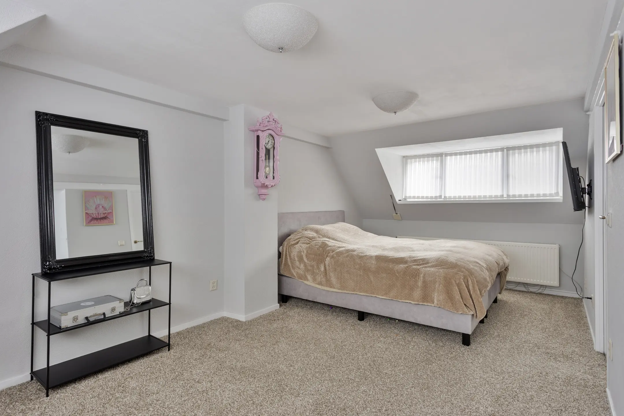 De slaapkamer is dankzij de dakkapel een volwaardige en lichte ruimte. Achter de knieschotten is extra opbergruimte gerealiseerd, waardoor deze verdieping niet alleen ruim maar ook praktisch is.