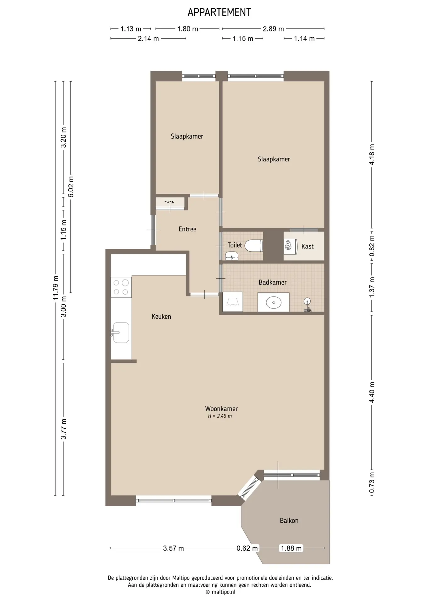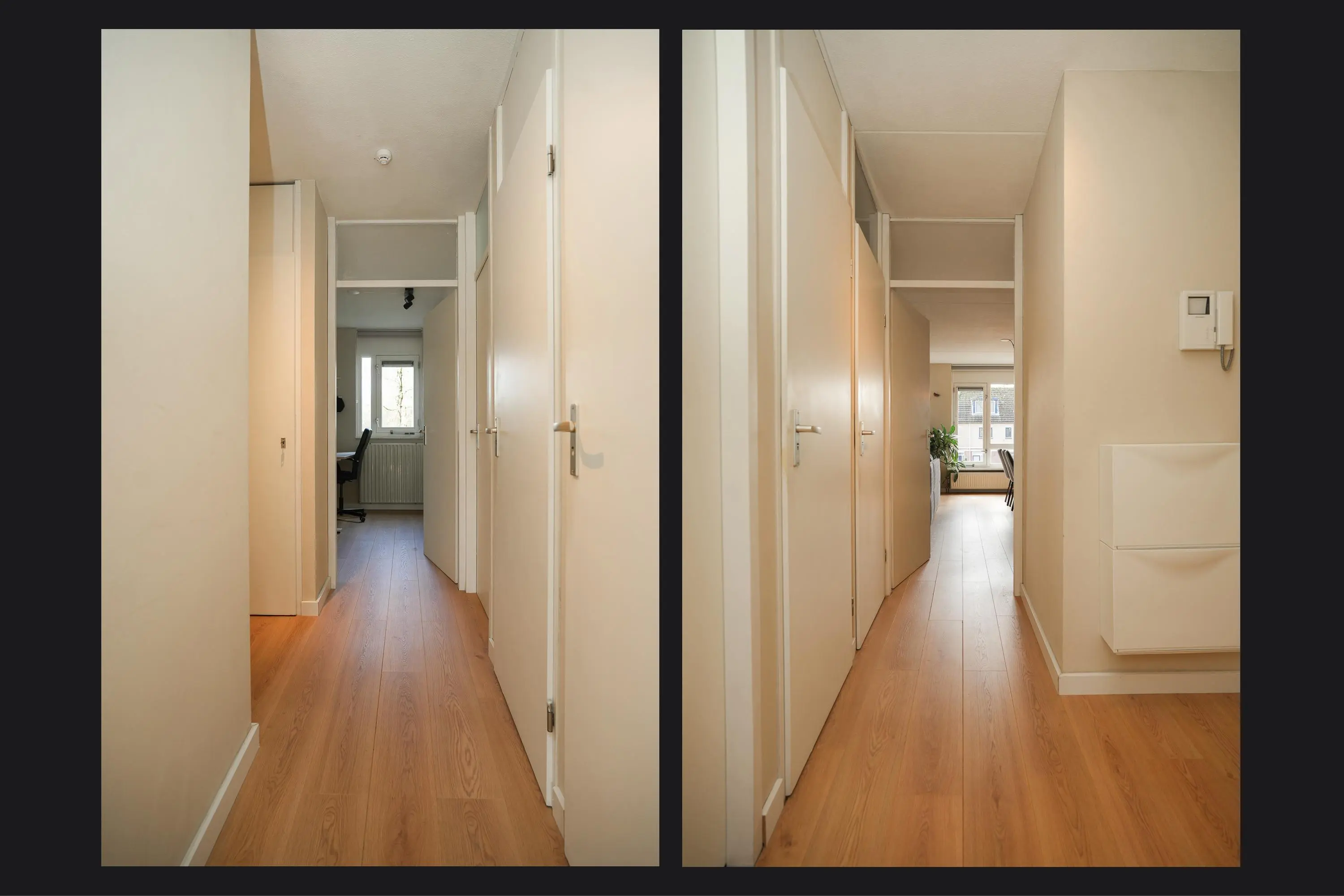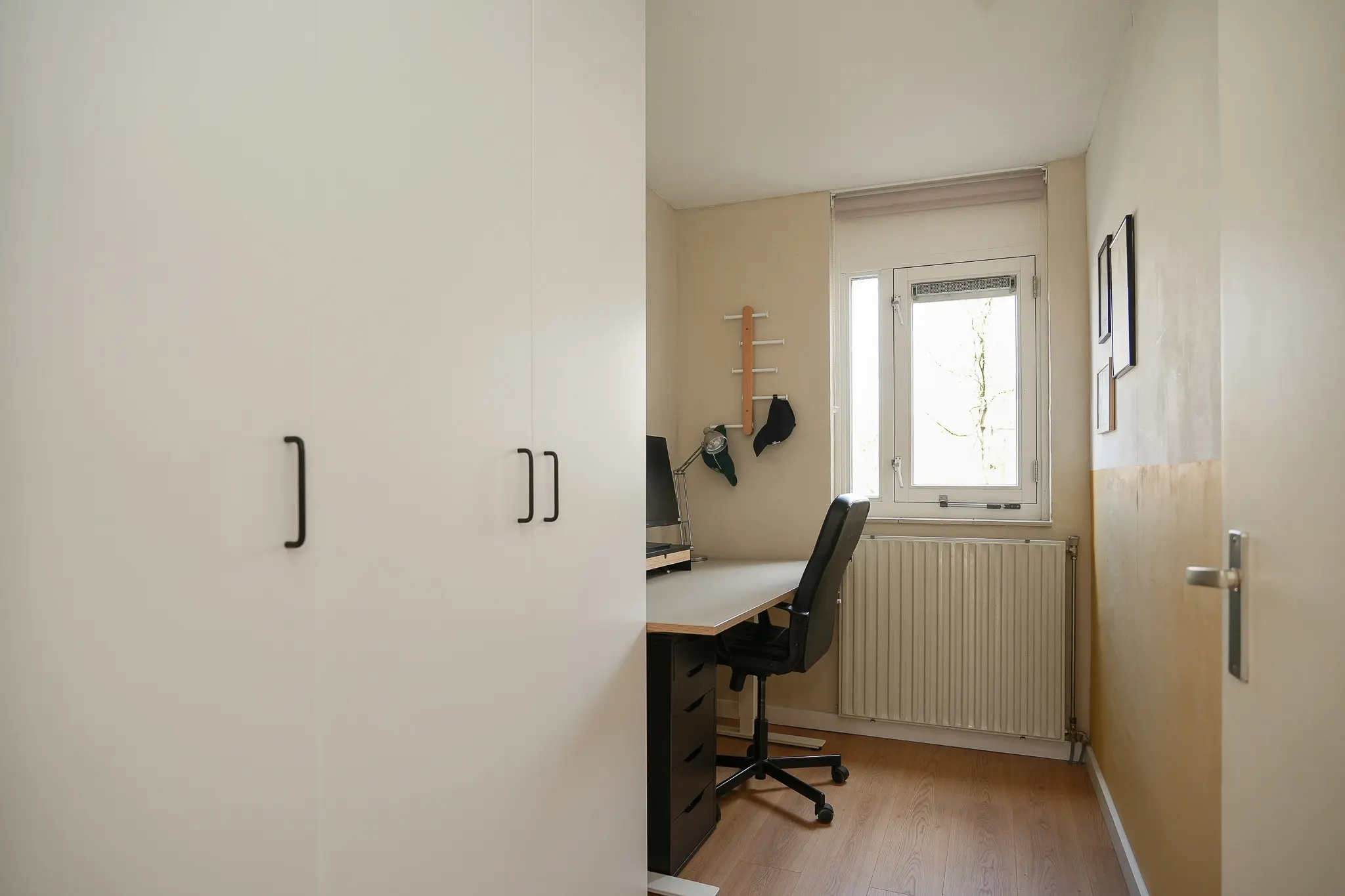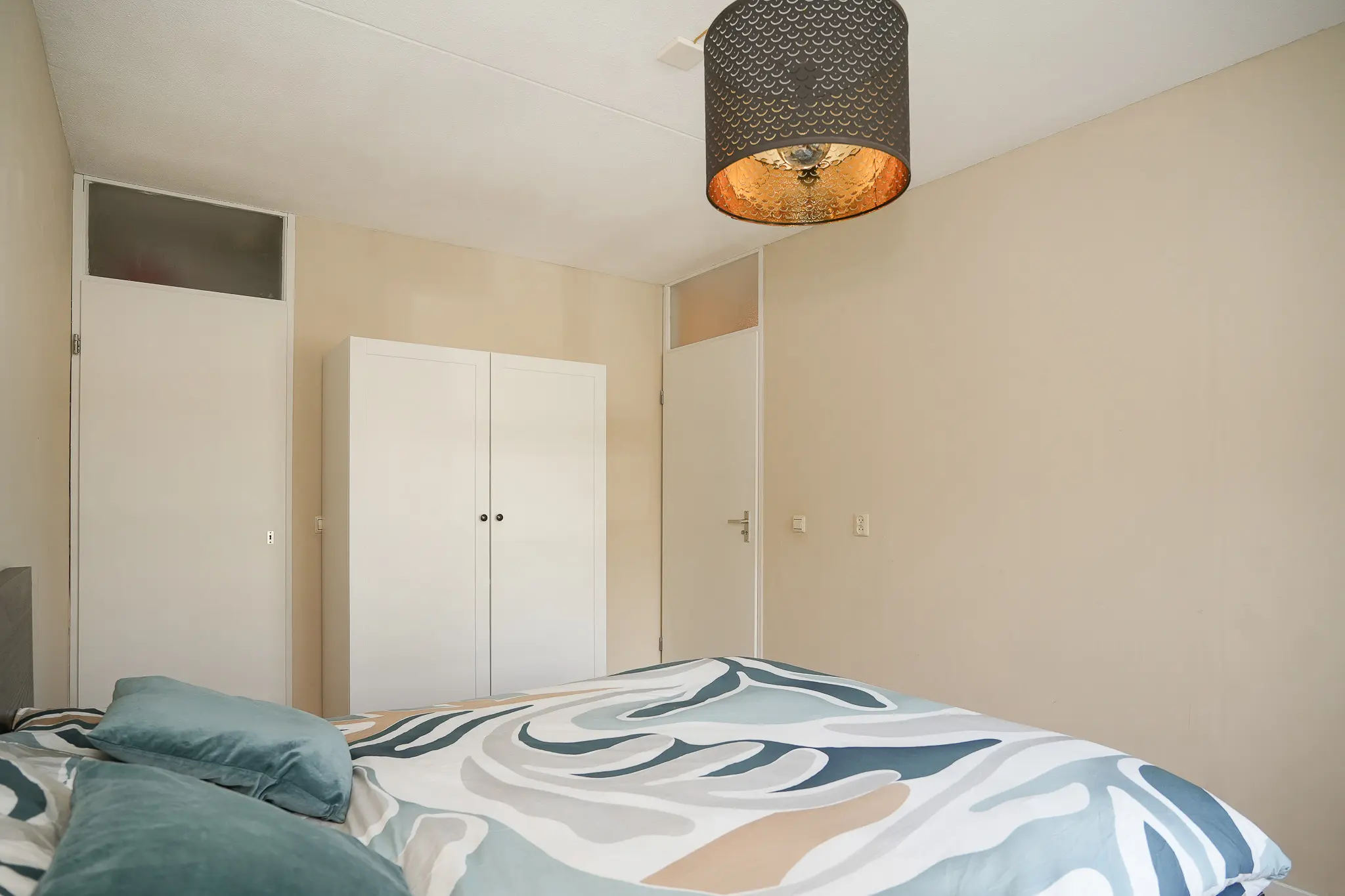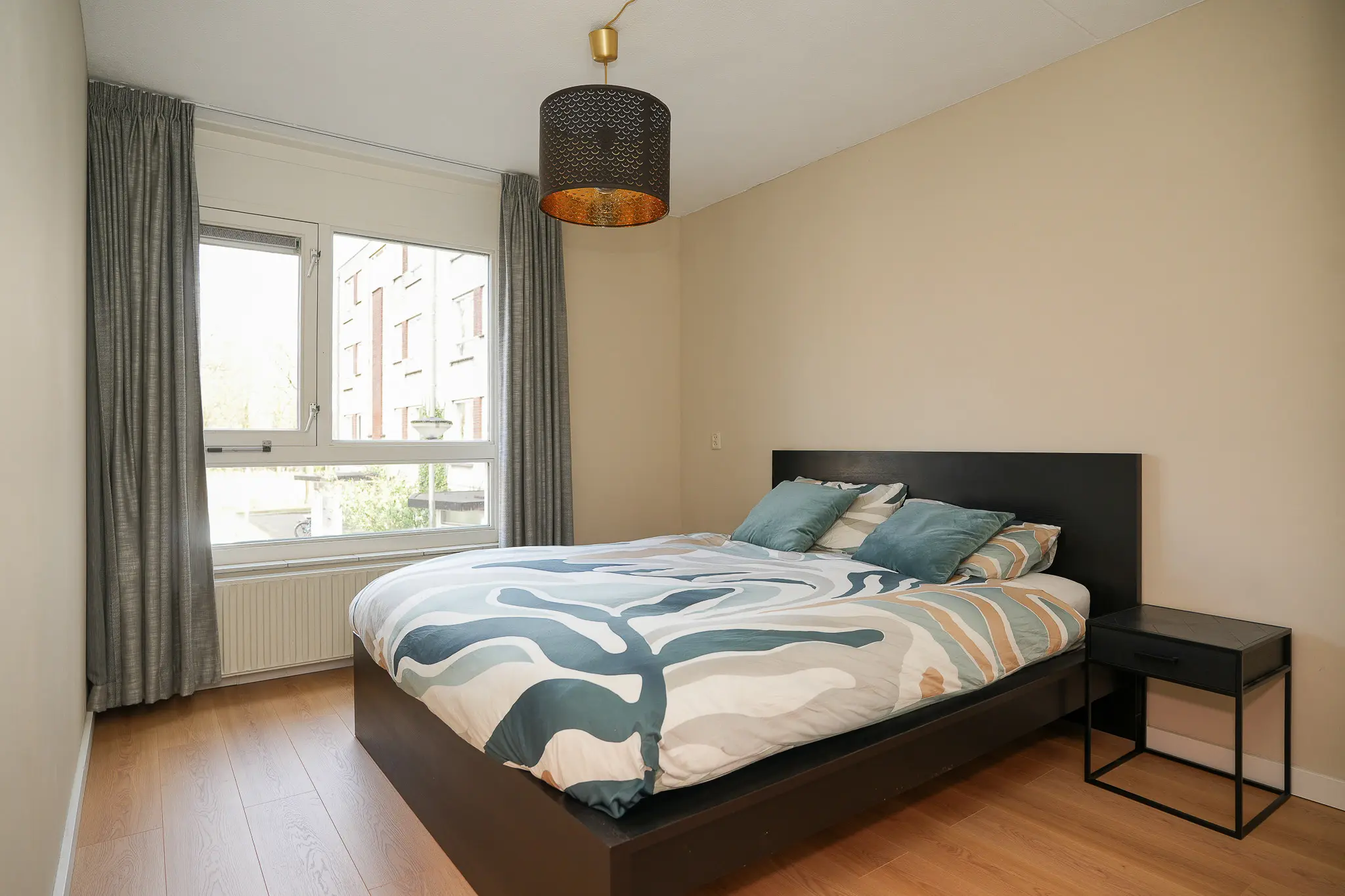 Aan de rustige achterzijde van het appartement bevinden zich twee slaapkamers. De hoofdslaapkamer biedt genoeg ruimte voor een groot bed en een kledingkast, terwijl de tweede kamer zich uitstekend leent als logeer-, kinder- of werkkamer.