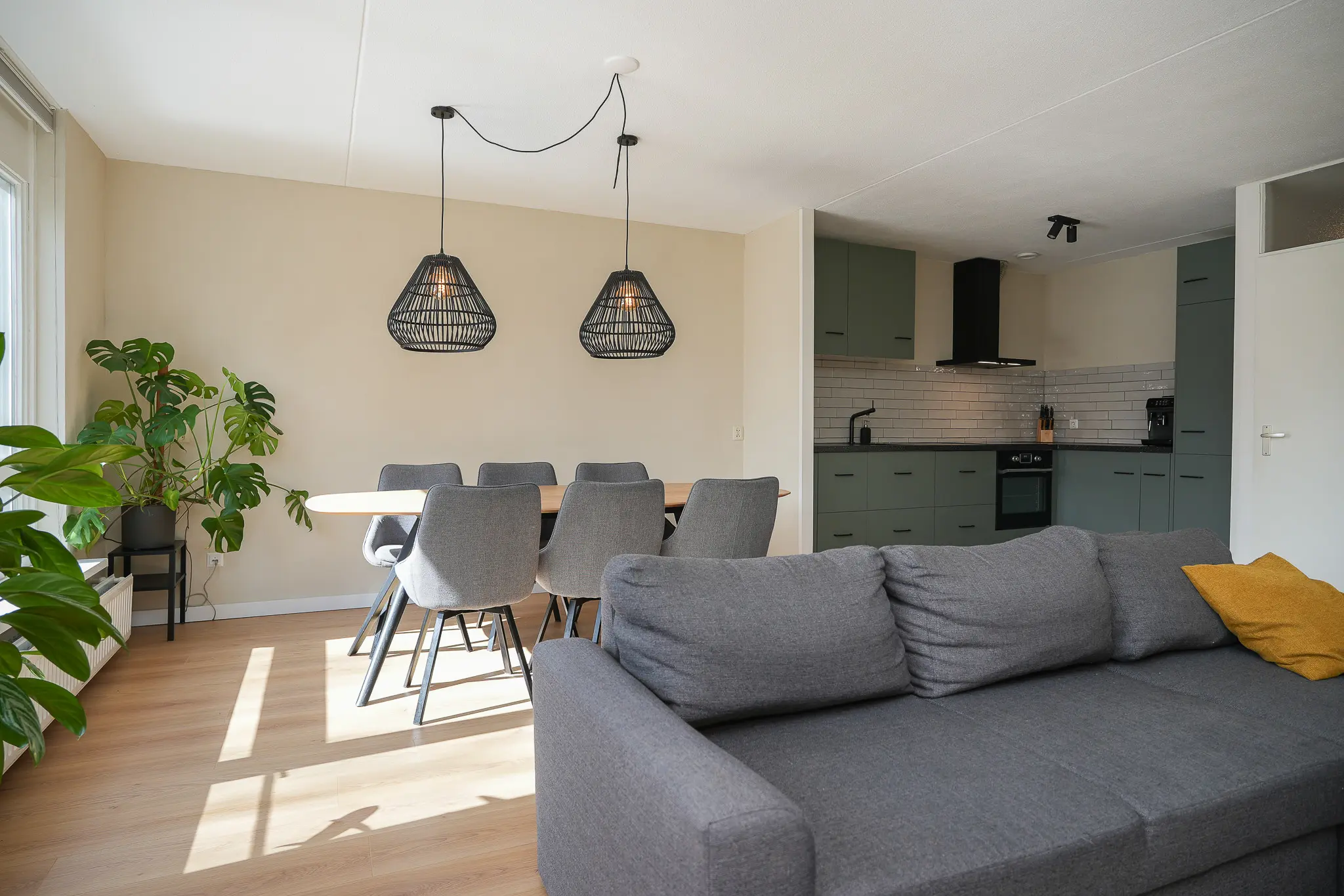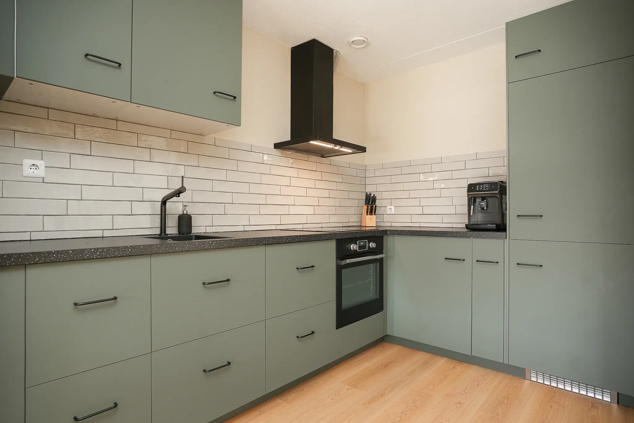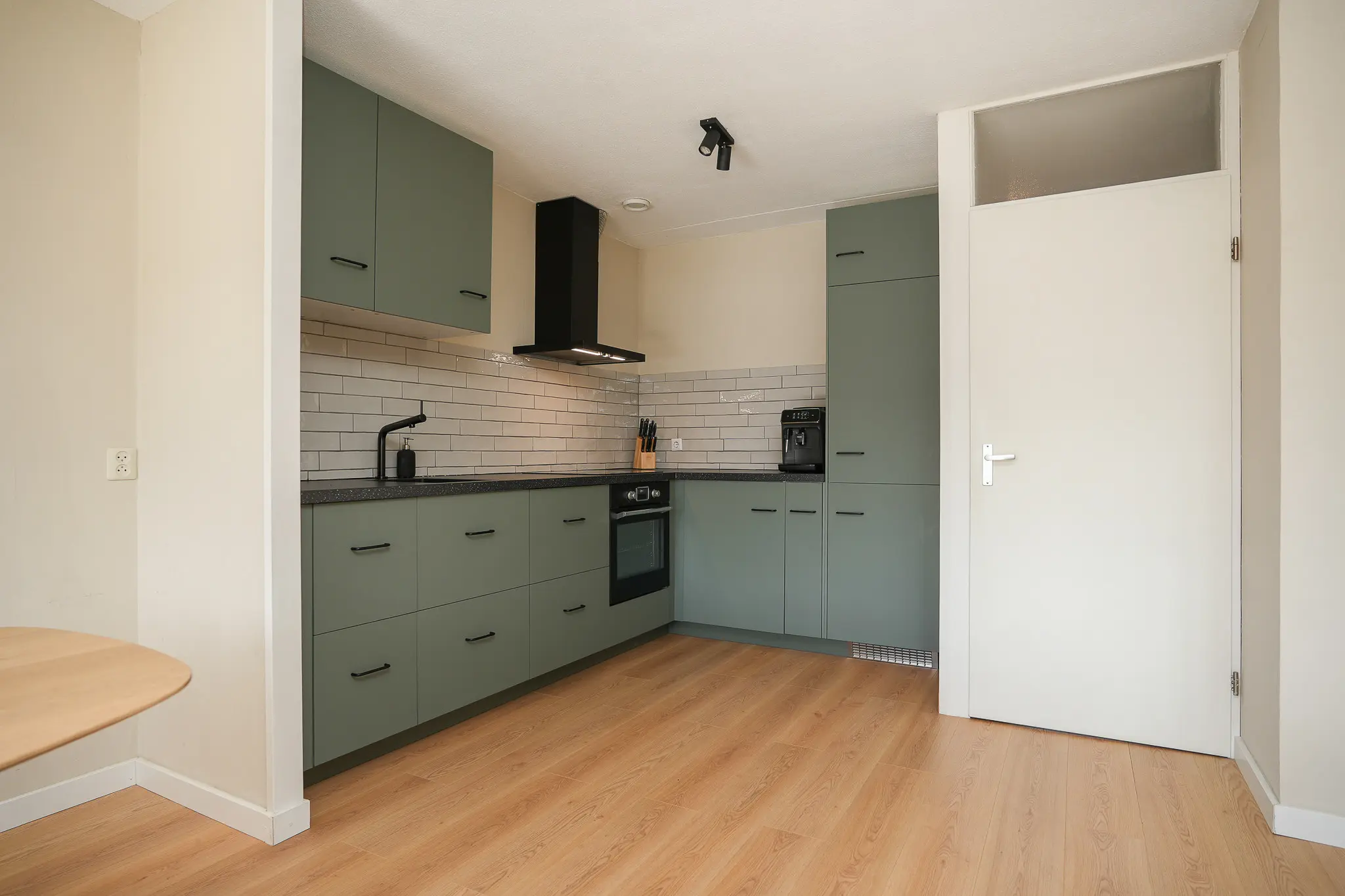 De open keuken sluit naadloos aan op de woonkamer en is in 2022 vernieuwd. De keuken in L-opstelling is uitgerust met inbouwapparatuur zoals kookplaat, oven, koelkast, vriezer en vaatwasser, waardoor je hier comfortabel kunt koken. Dankzij de praktische indeling heb je veel werkblad en opbergruimte; de pannen en glazen zijn zo binnen handbereik.