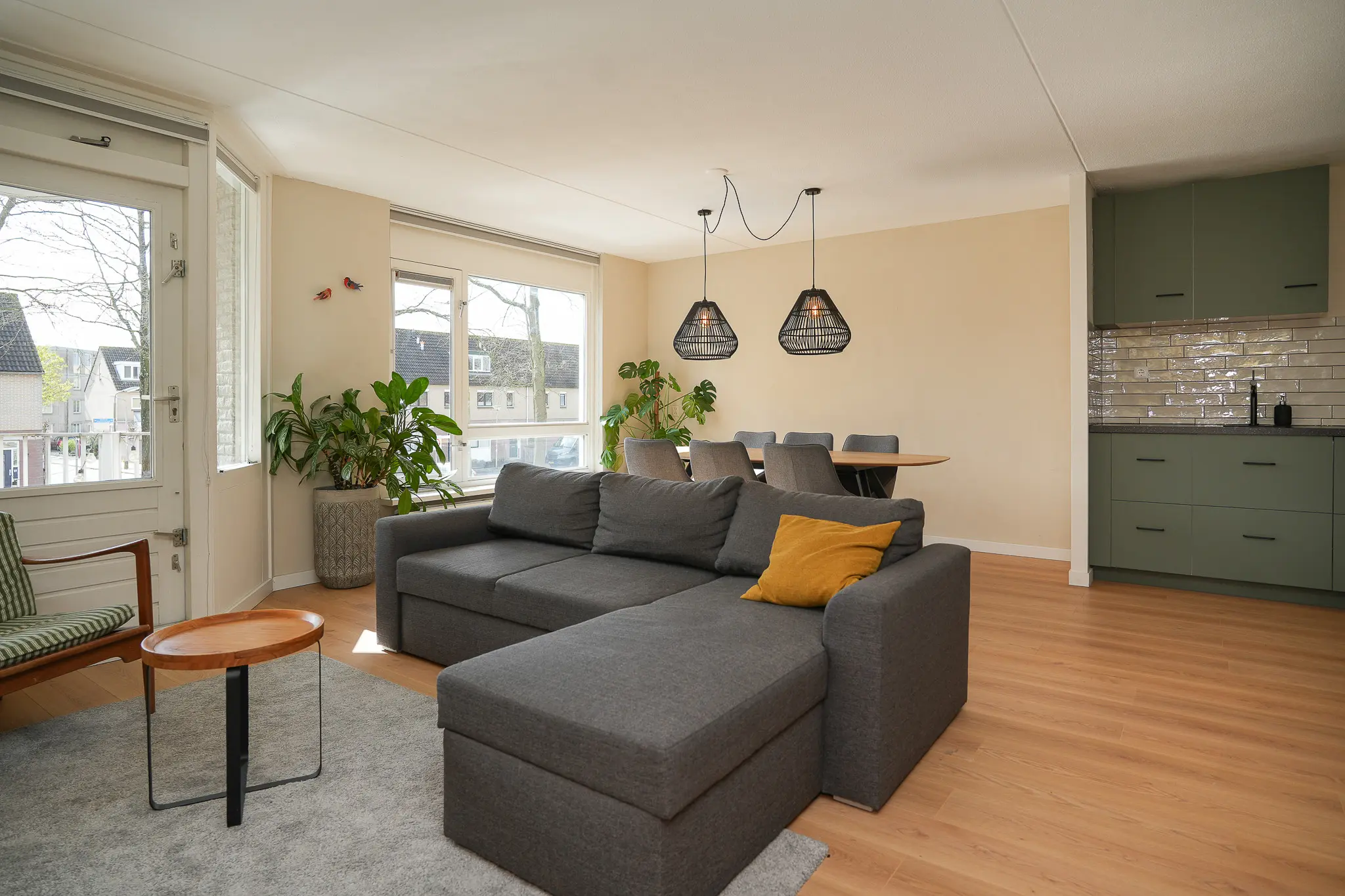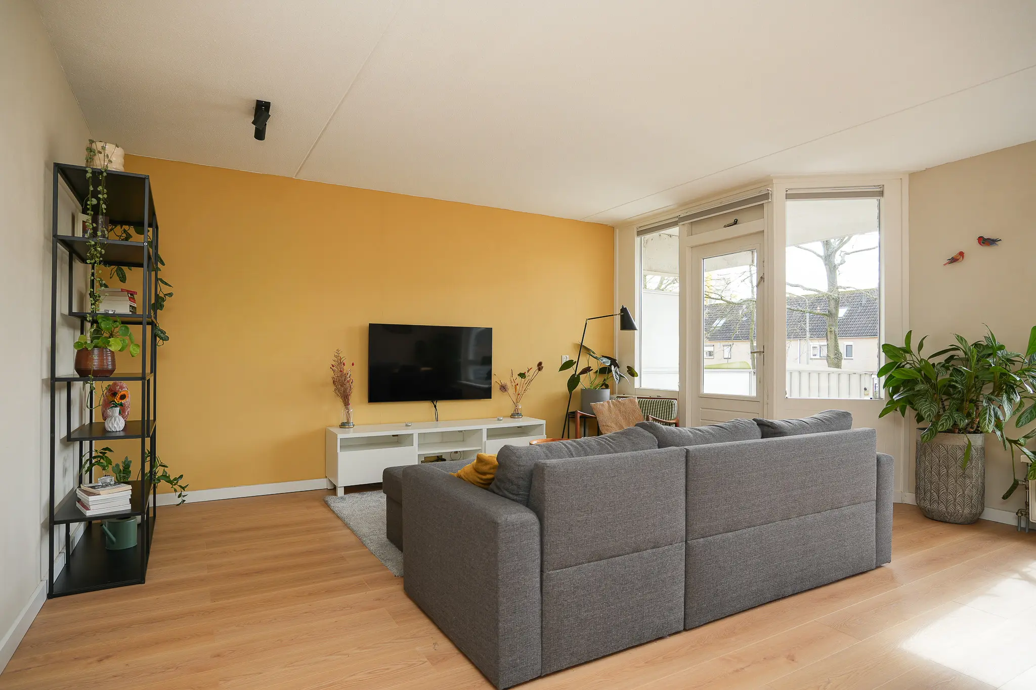 Op de eerste verdieping stap je binnen in de hal die direct toegang geeft tot alle vertrekken. Aan de voorzijde ligt de ruime woonkamer, waar grote ramen zorgen voor veel licht en een prettig uitzicht op het water en het groen rondom het complex. De doorgelegde laminaatvloer geeft het geheel een moderne, rustige uitstraling.