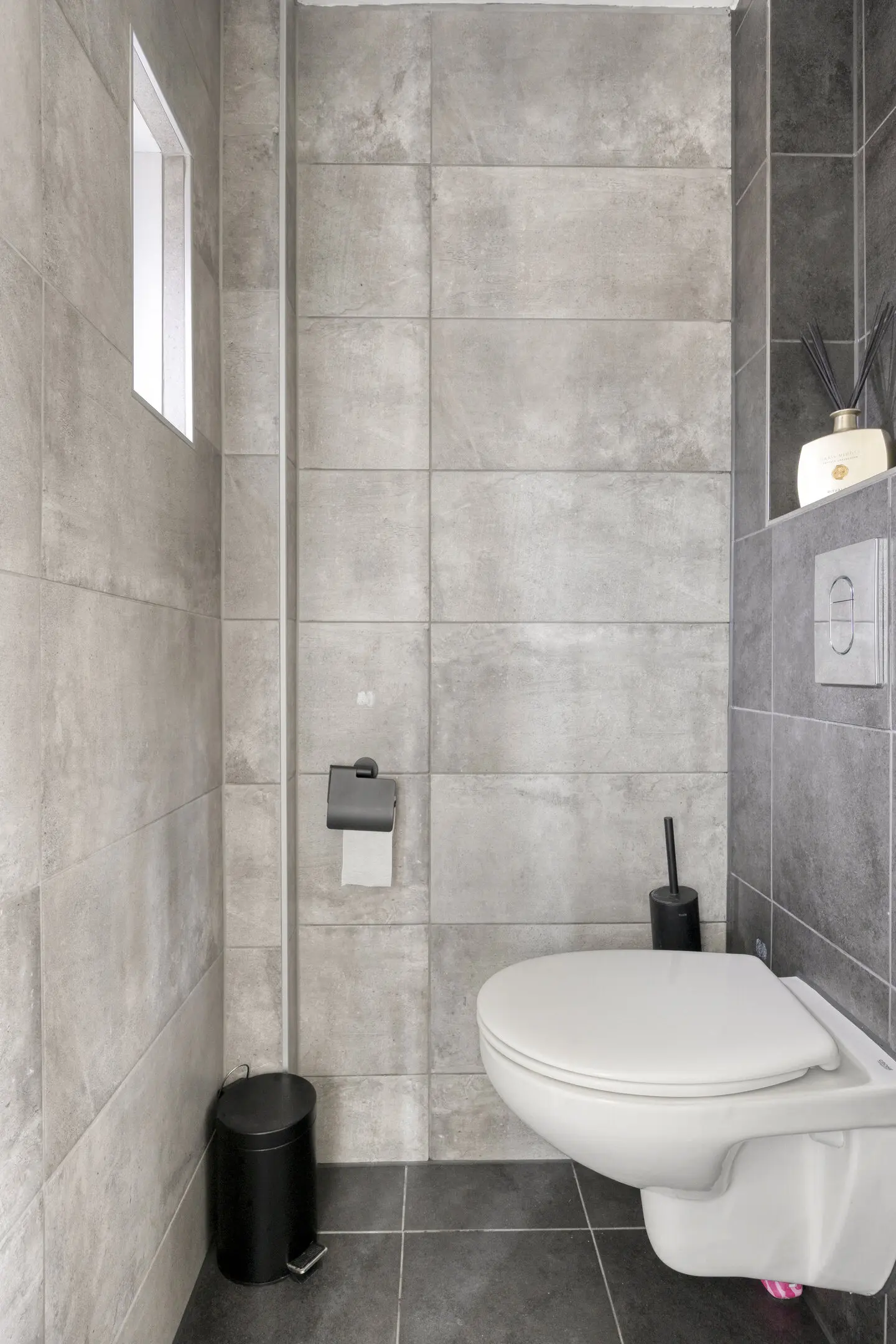 Het toilet is modern uitgevoerd en voorzien van een hangcloset.