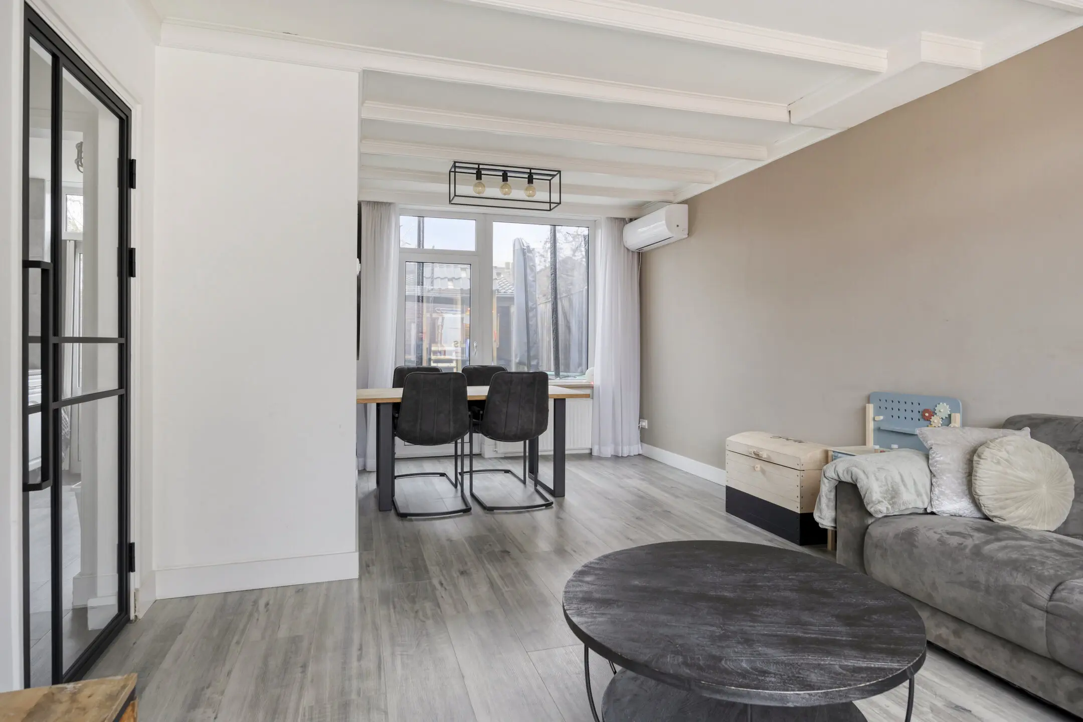De woonkamer is licht en sfeervol, met strak gestucte wanden en grote ramen met kunststof kozijnen. Dankzij de rolluiken aan zowel de voor- als achterzijde geniet u van extra comfort, privacy en isolatie. De aanwezige airconditioning zorgt het hele jaar door voor een aangenaam binnenklimaat. Vanuit de woonkamer heeft u directe toegang tot de achtertuin.