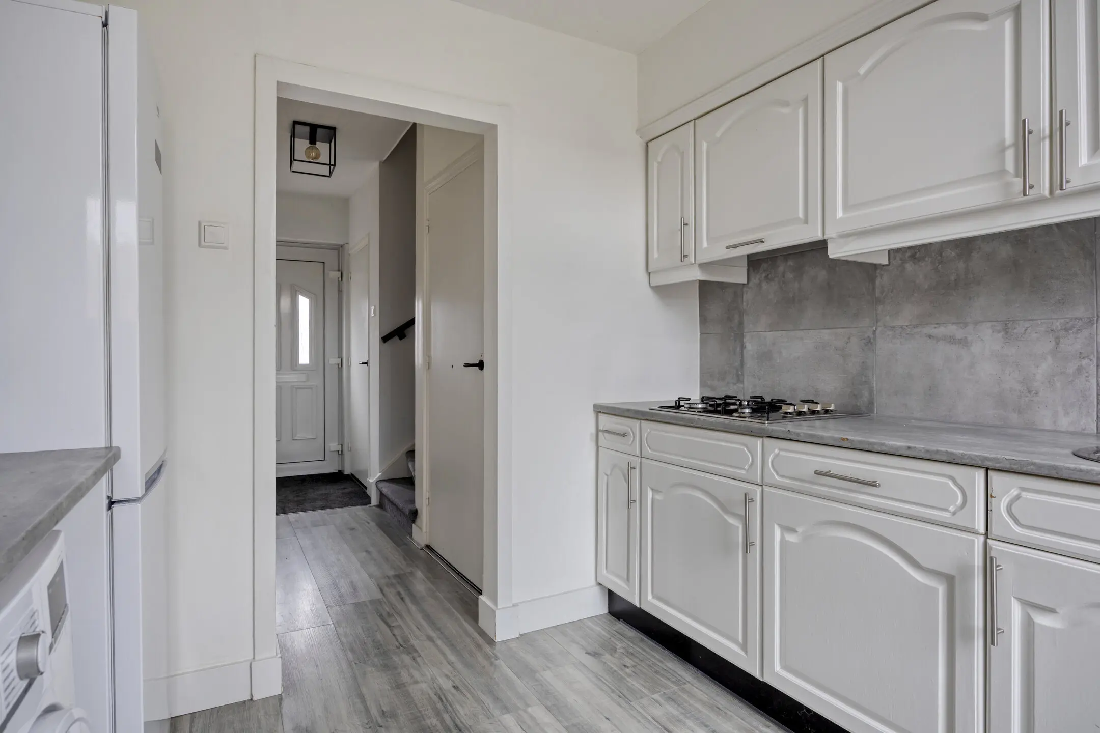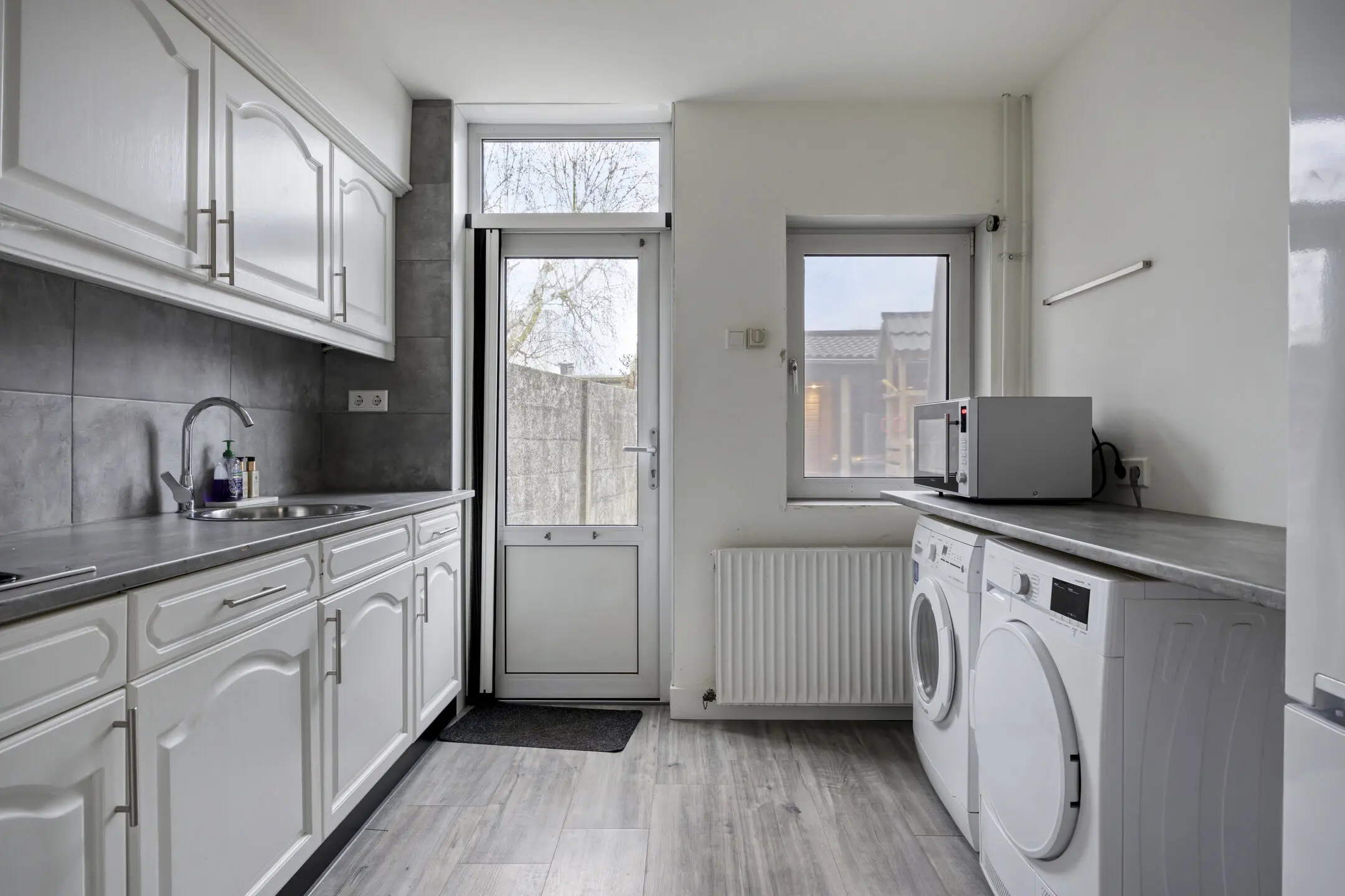 Via de hal bereikt u de keuken, die is uitgevoerd in een lichte kleurstelling en beschikt over voldoende werk- en kastruimte. Vanuit de keuken heeft u eveneens toegang tot de achtertuin. Hier bevindt zich ook de wasmachineopstelling, met voldoende ruimte voor zowel een wasmachine als een droger, praktisch en netjes geïntegreerd.