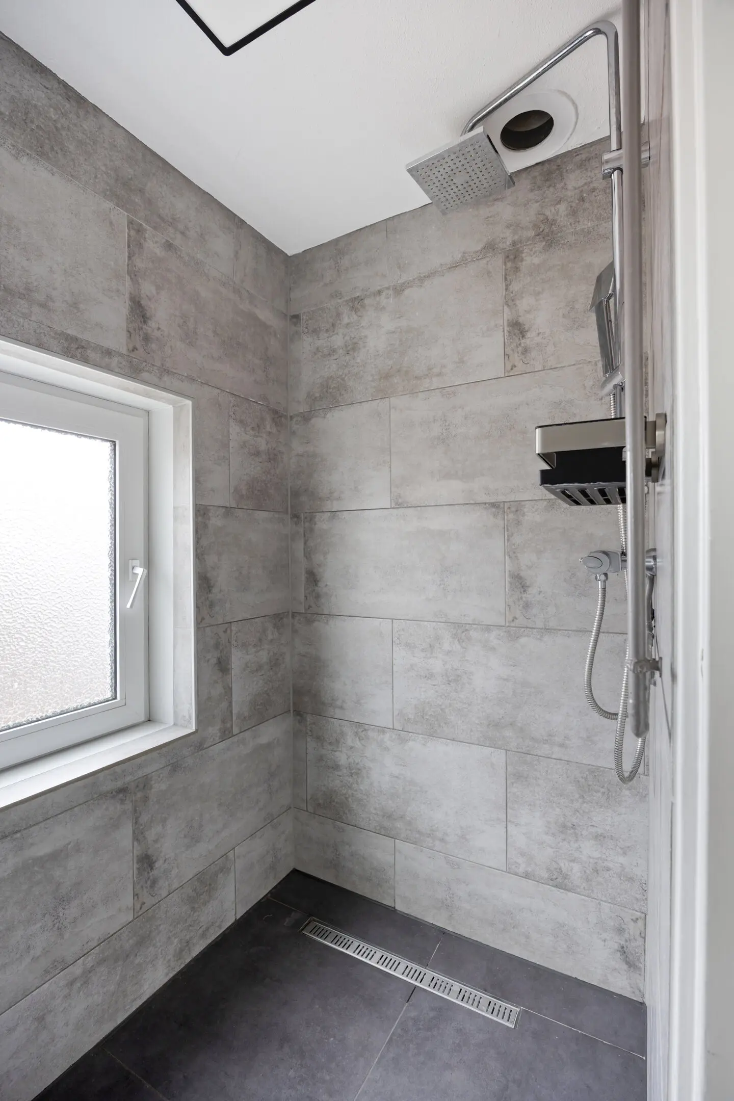 De badkamer is enkele jaren geleden volledig gemoderniseerd en uitgevoerd met moderne tegelafwerking, een ruime inloopdouche met stort- en handdouche en een wastafel.