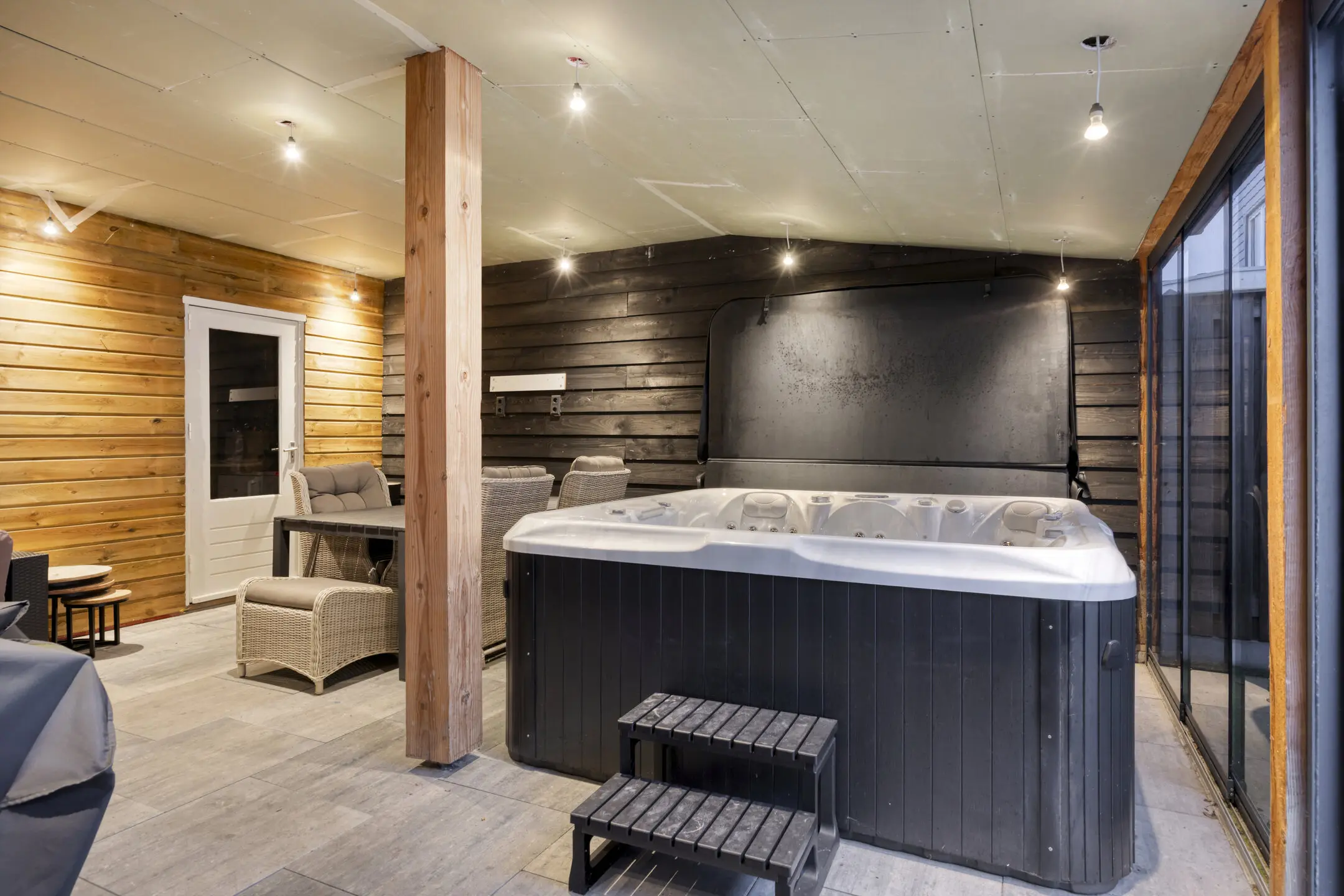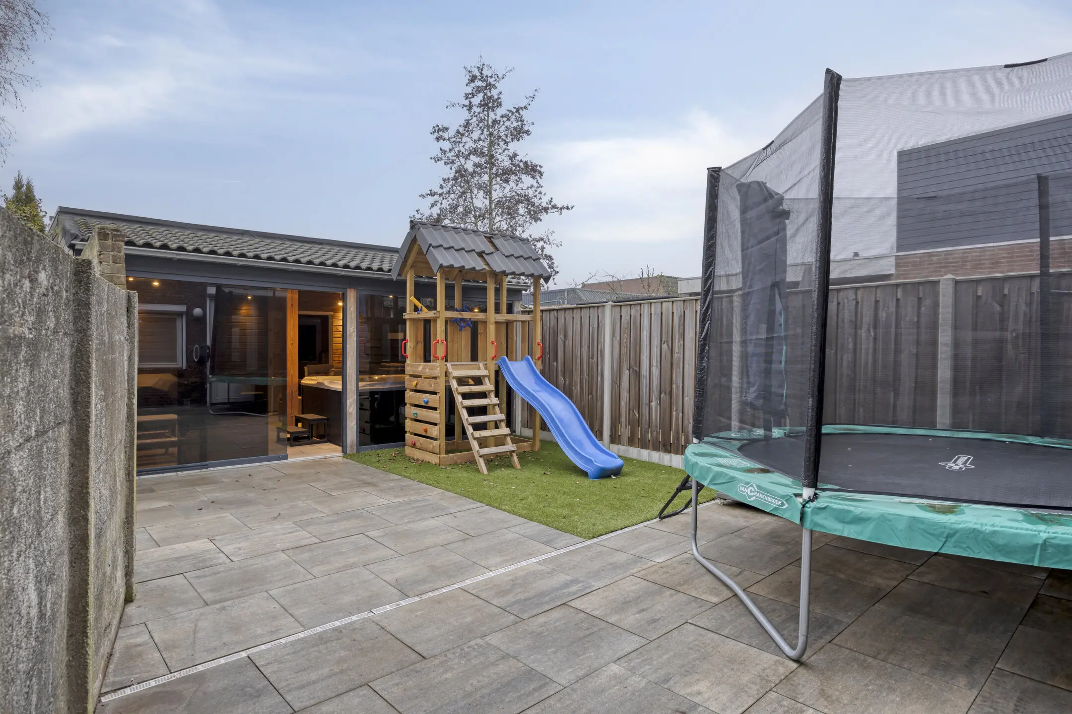 De achtertuin is modern en onderhoudsvriendelijk aangelegd en deels betegeld. Achterin de tuin bevindt zich een grote, hoogwaardige overkapping die momenteel is ingericht als wellness- en relaxruimte, compleet met jacuzzi, loungehoek, eettafel en ruimte voor een barbecue. Dankzij de glazen schuifwanden is deze ruimte volledig afsluitbaar en het hele jaar door te gebruiken.