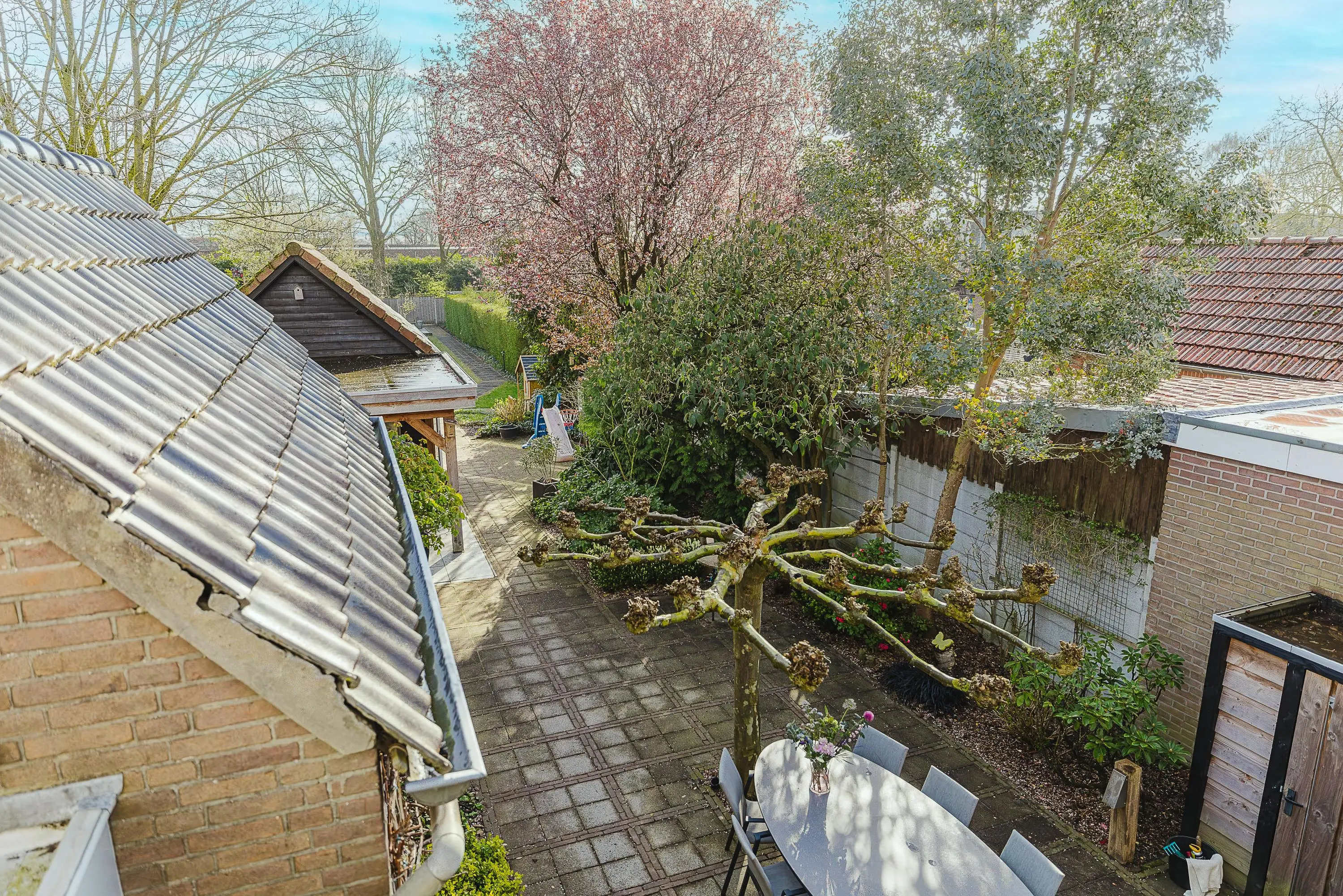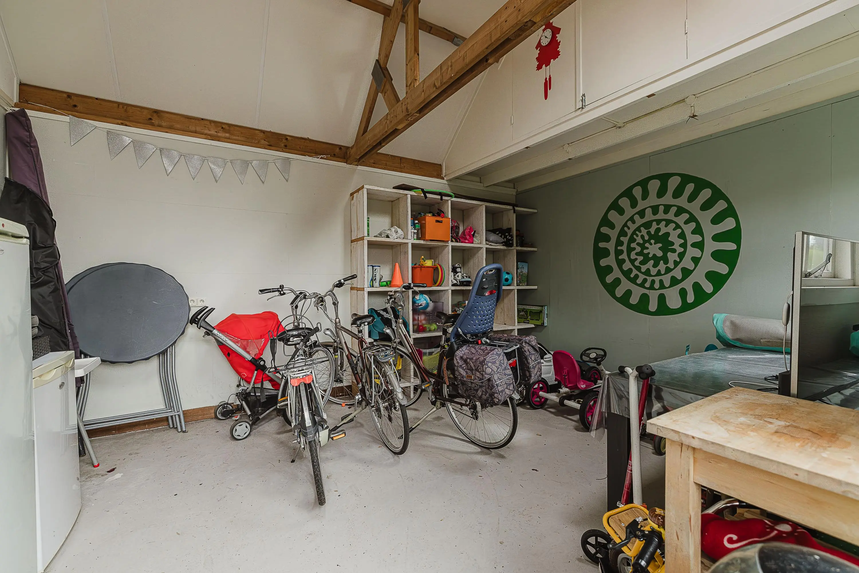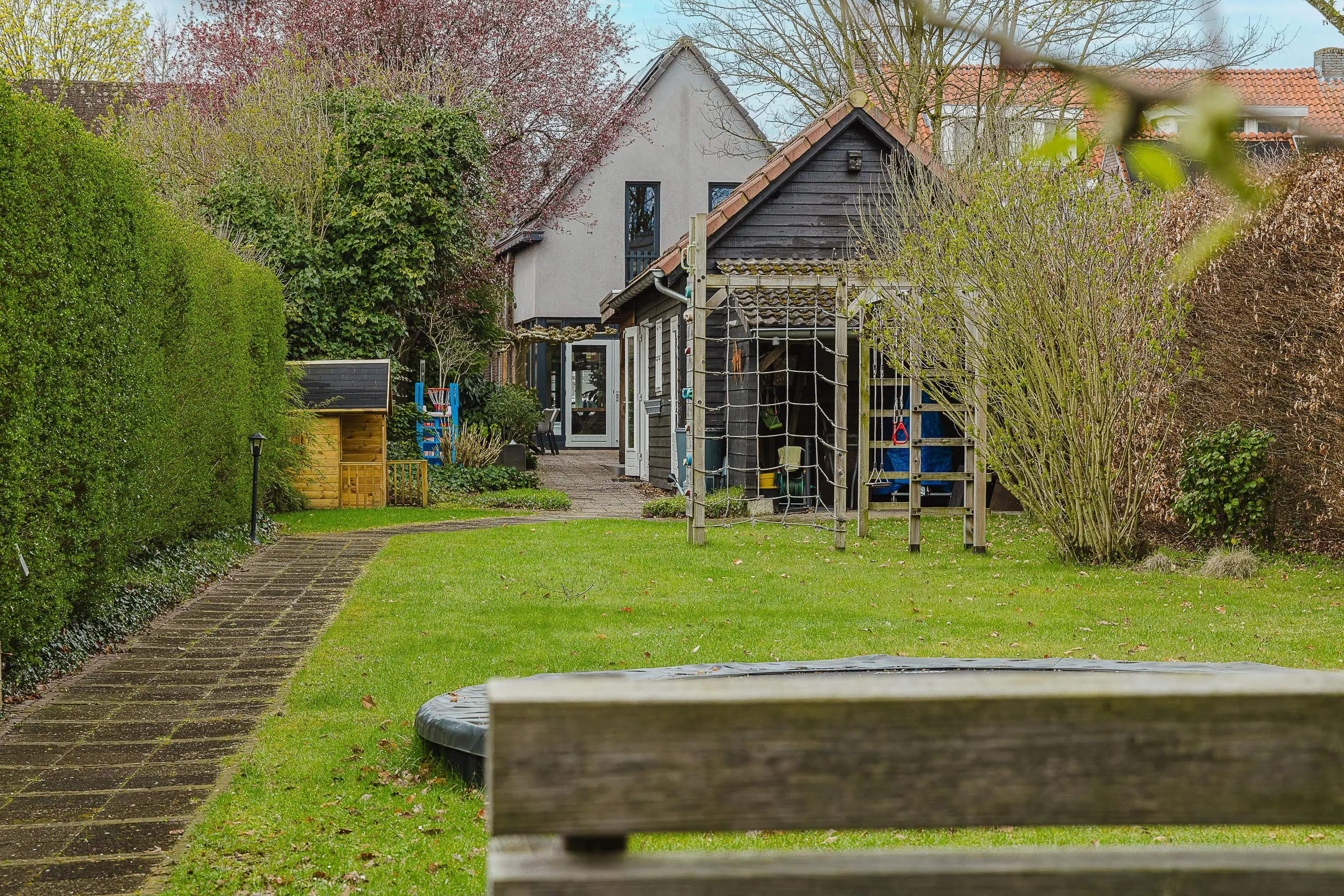 Via de openslaande deuren in de eetkamer en speelkamer betreed je de zeer diepe tuin van circa 650 m². De tuin beschikt over een overkapping bij de grote vrijstaande berging, die is opgedeeld in twee delen en voorzien is van elektra en een bergvliering. In de tuin bevinden zich meerdere grondwatertappunten. Zowel aan de voor- als achterzijde van de tuin kun je het perceel verlaten via een poort.