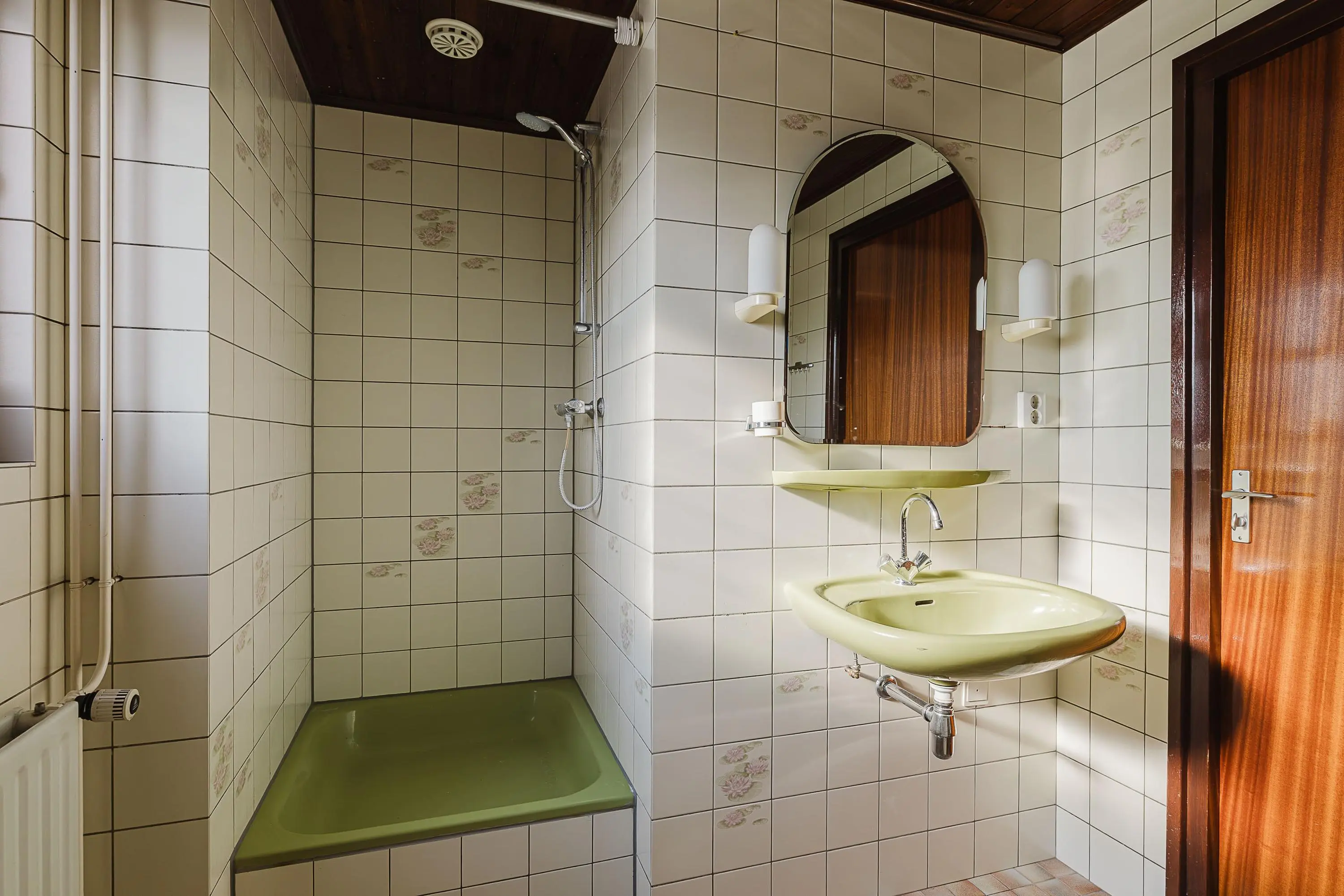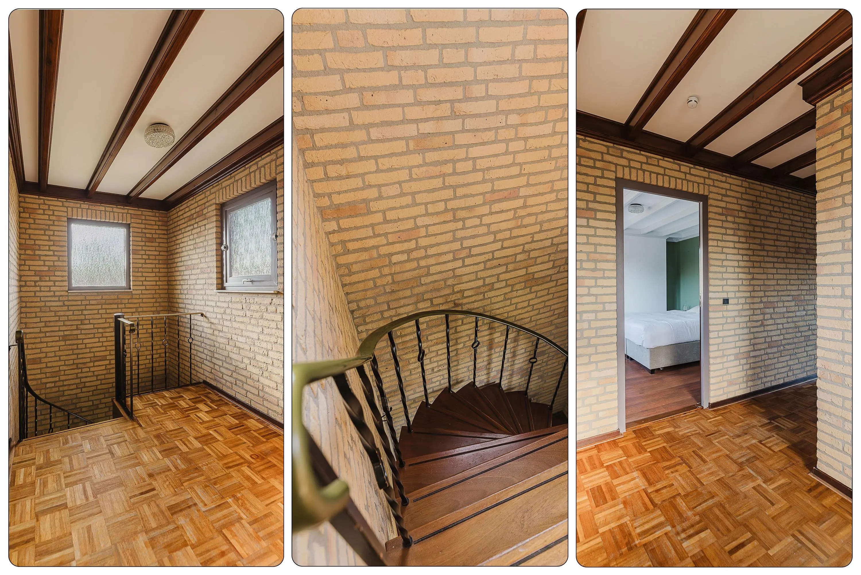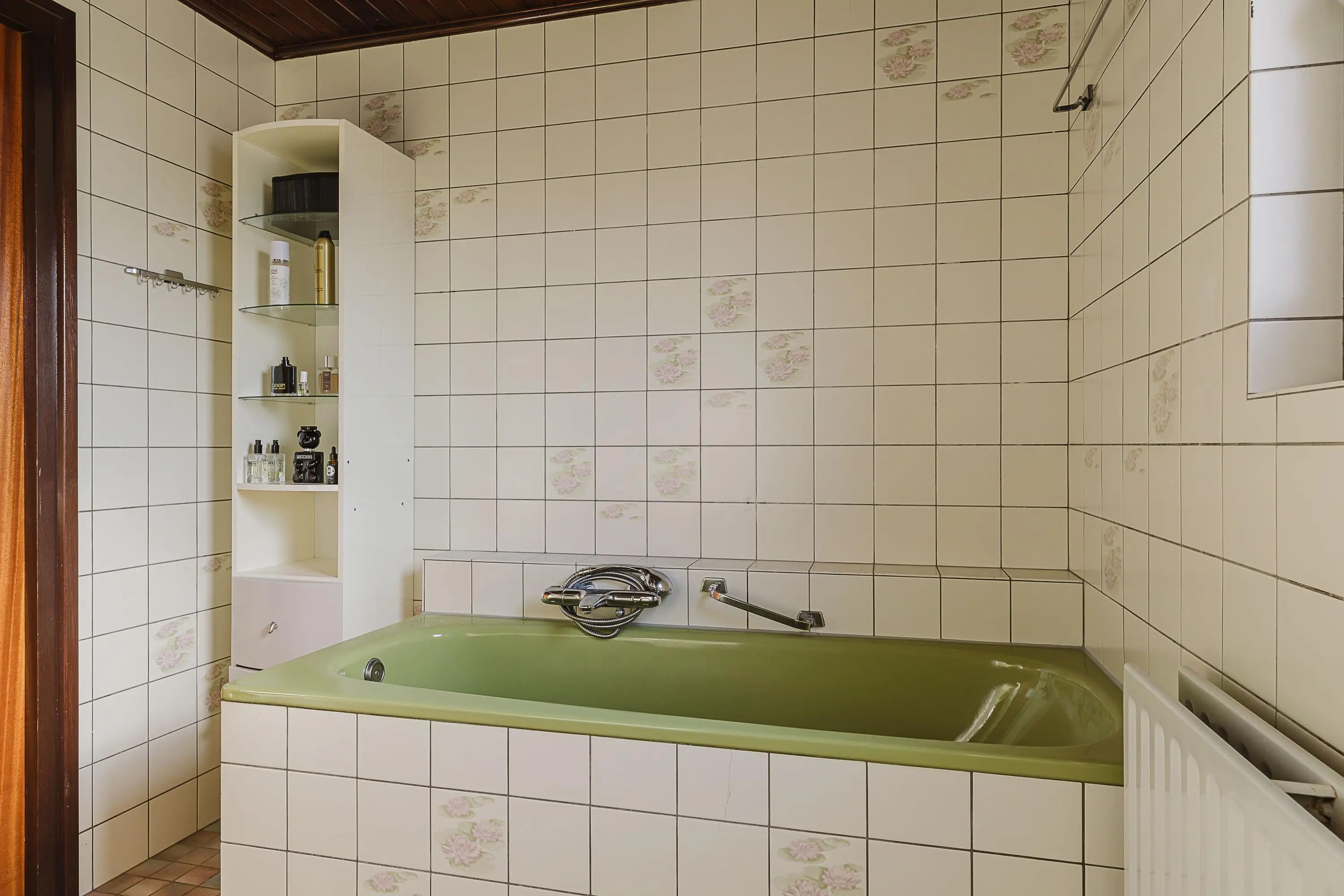 Op de eerste verdieping v.v. parketvloer vinden we een drietal ruime slaapkamers, separaat toilet en een retro badkamer v.v. ligbad, wastafel en douche met hand-douche.