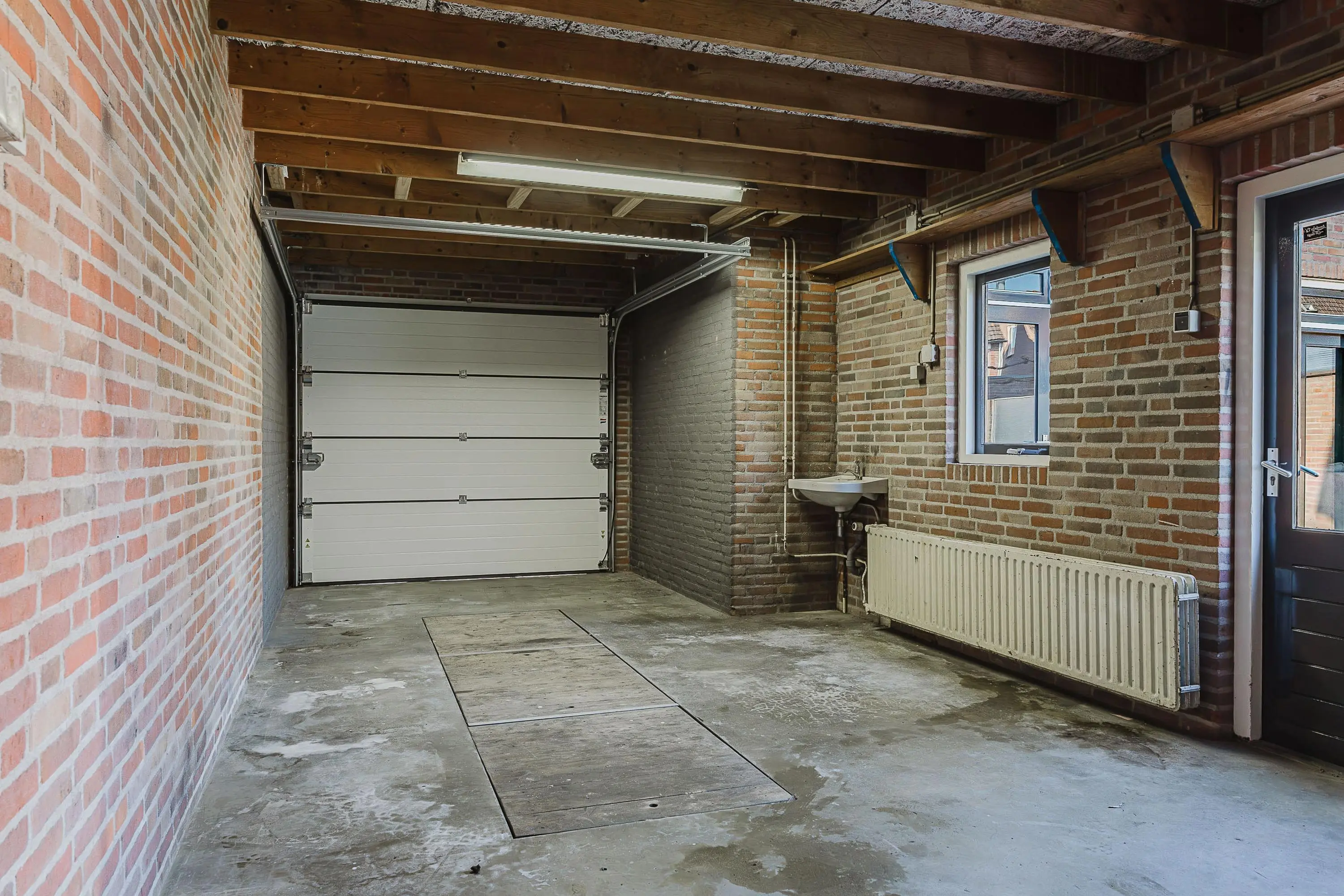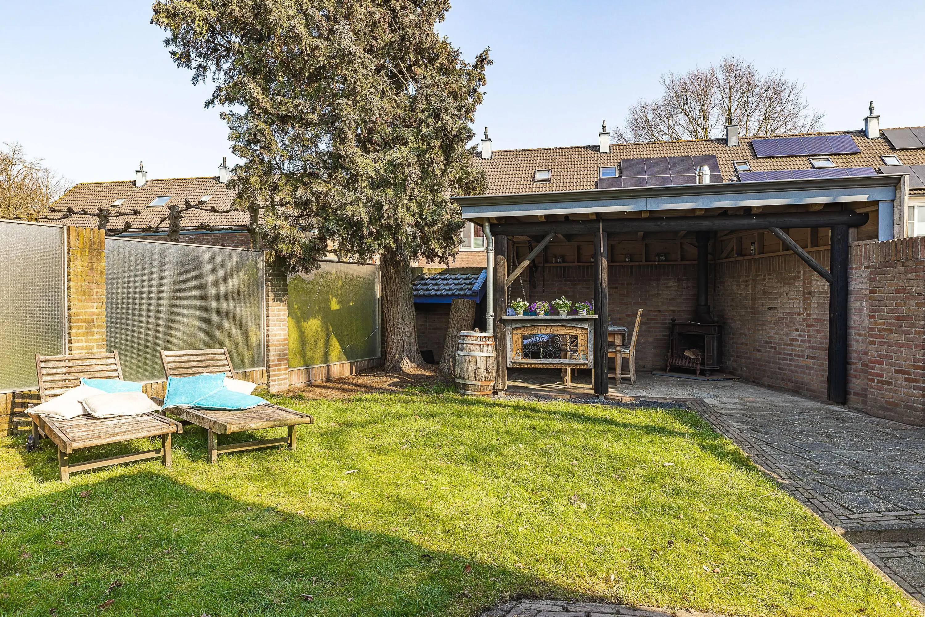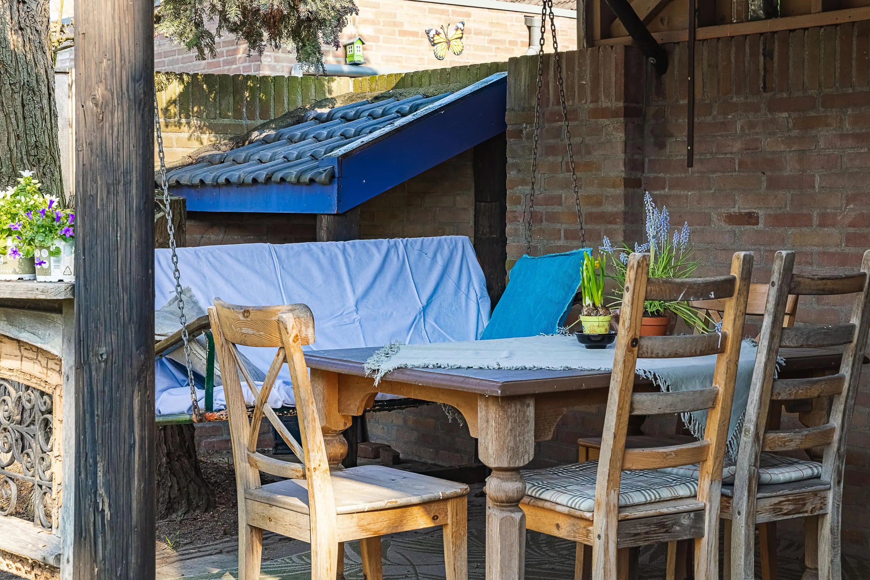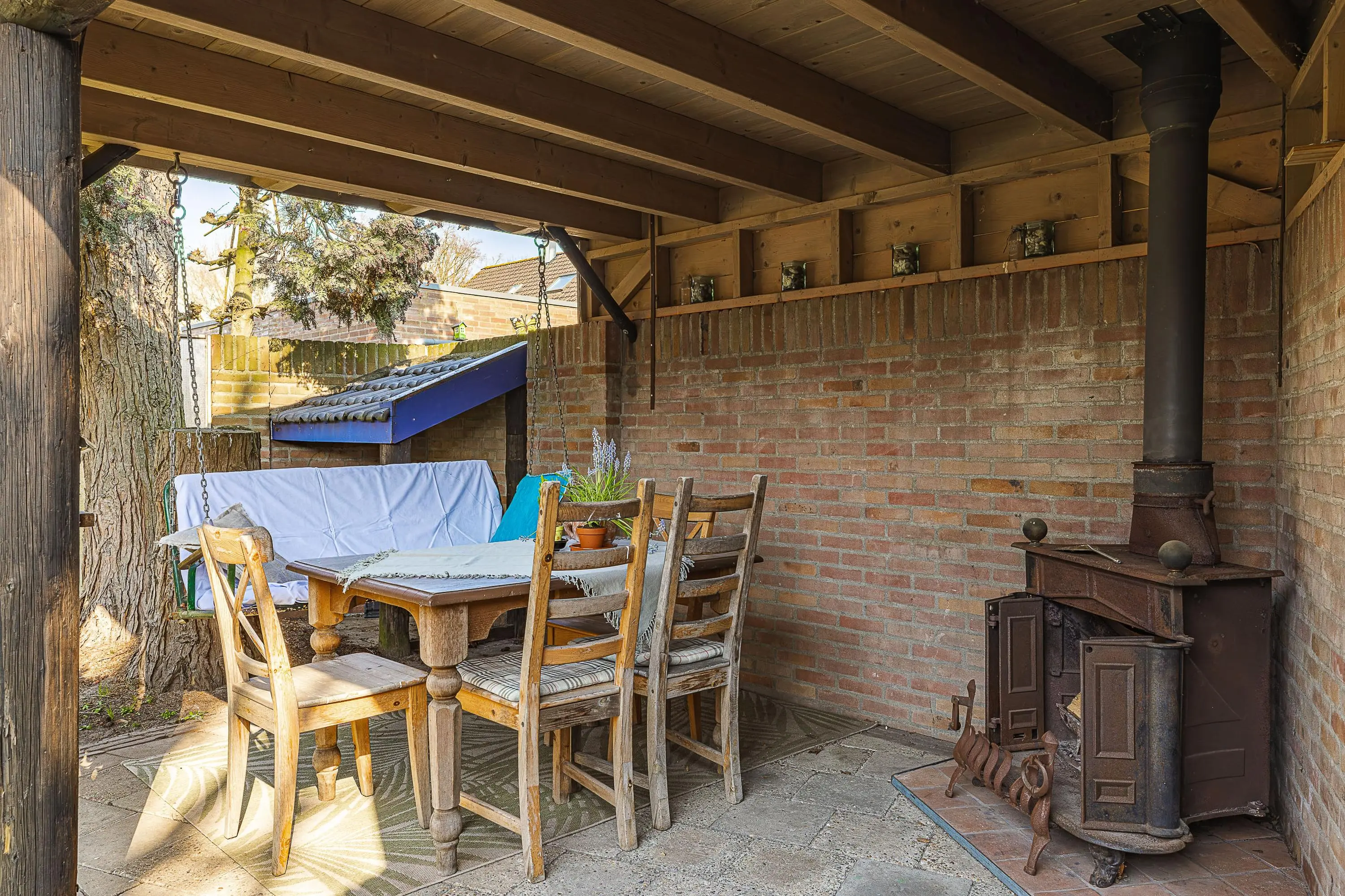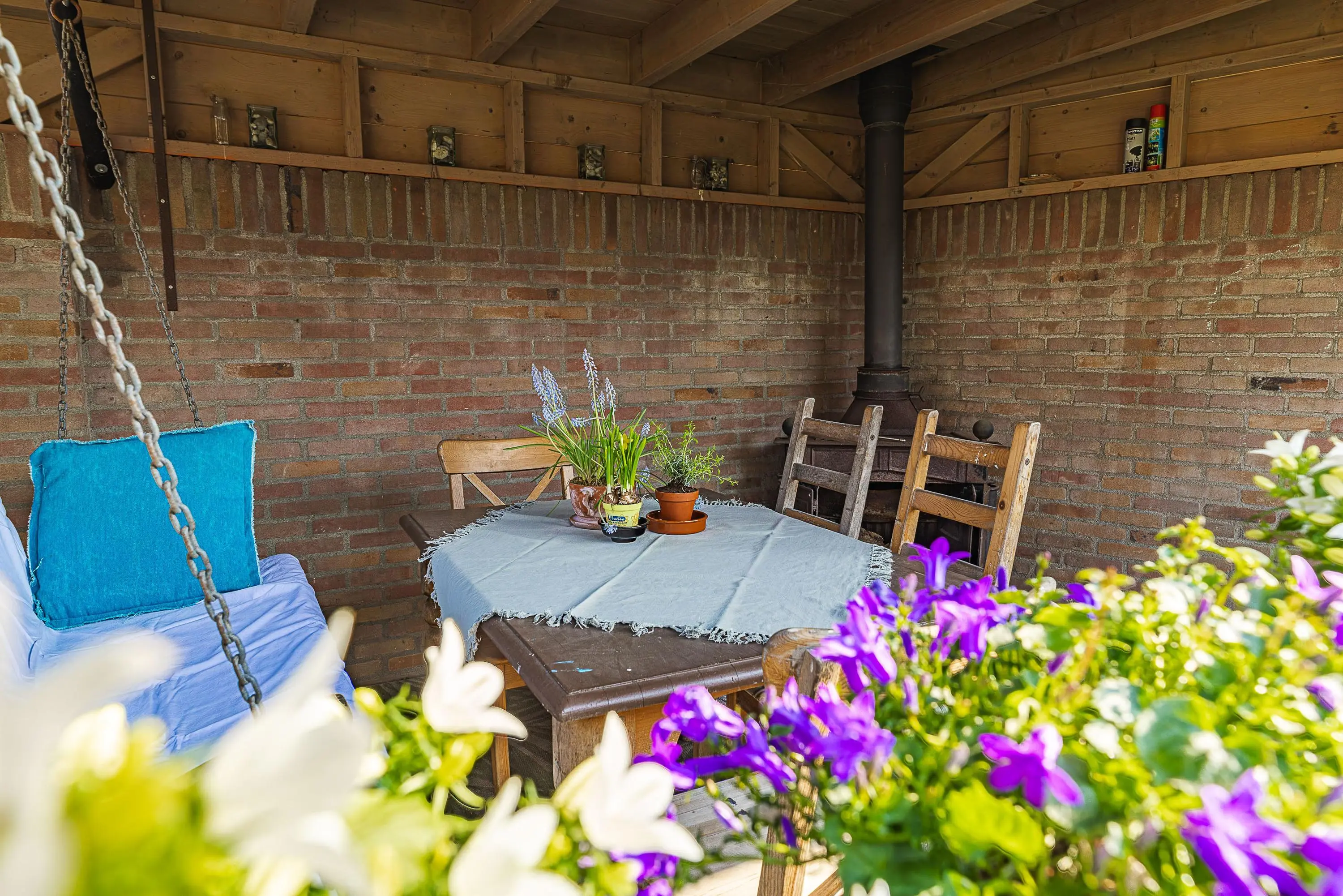 Middels de grote schuifpui of de deur via de bijkeuken kom je terecht in de ruime tuin. De tuin heeft een overkapping aan de achterzijde met een houtkachel, grote poort naar de parkeerplaats en biedt tevens toegang tot de ruime garage van ca. 28 m2.
