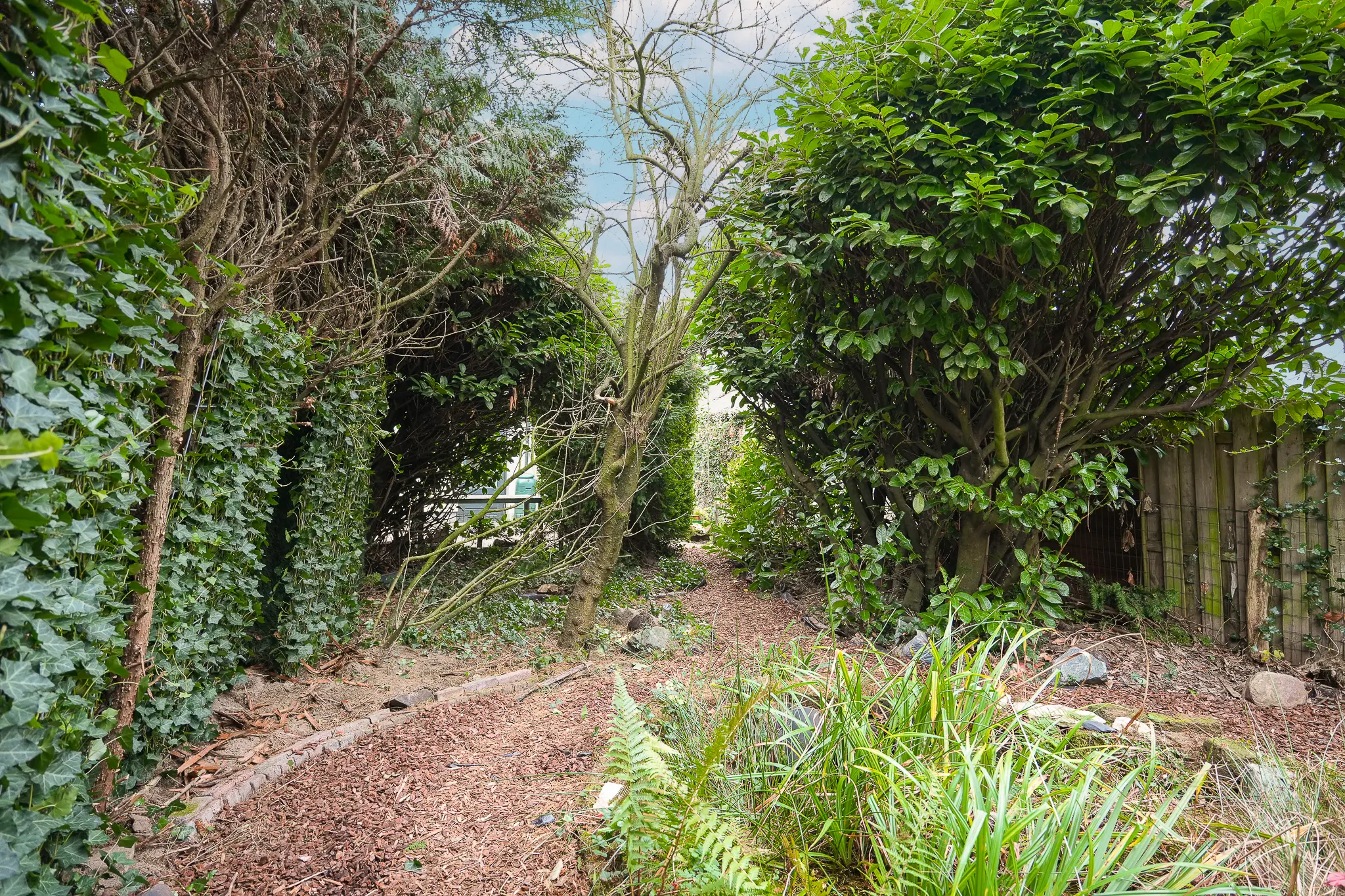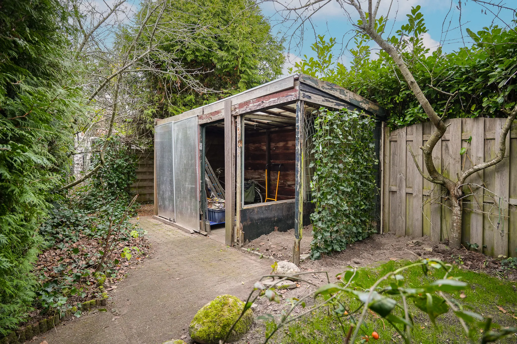 Achter in de tuin staan een grote houten berging en een extra houten schuur, ideaal als opslag, werkruimte of hobbyruimte. De huidige kippenren kan uiteraard naar wens behouden of verwijderd worden.