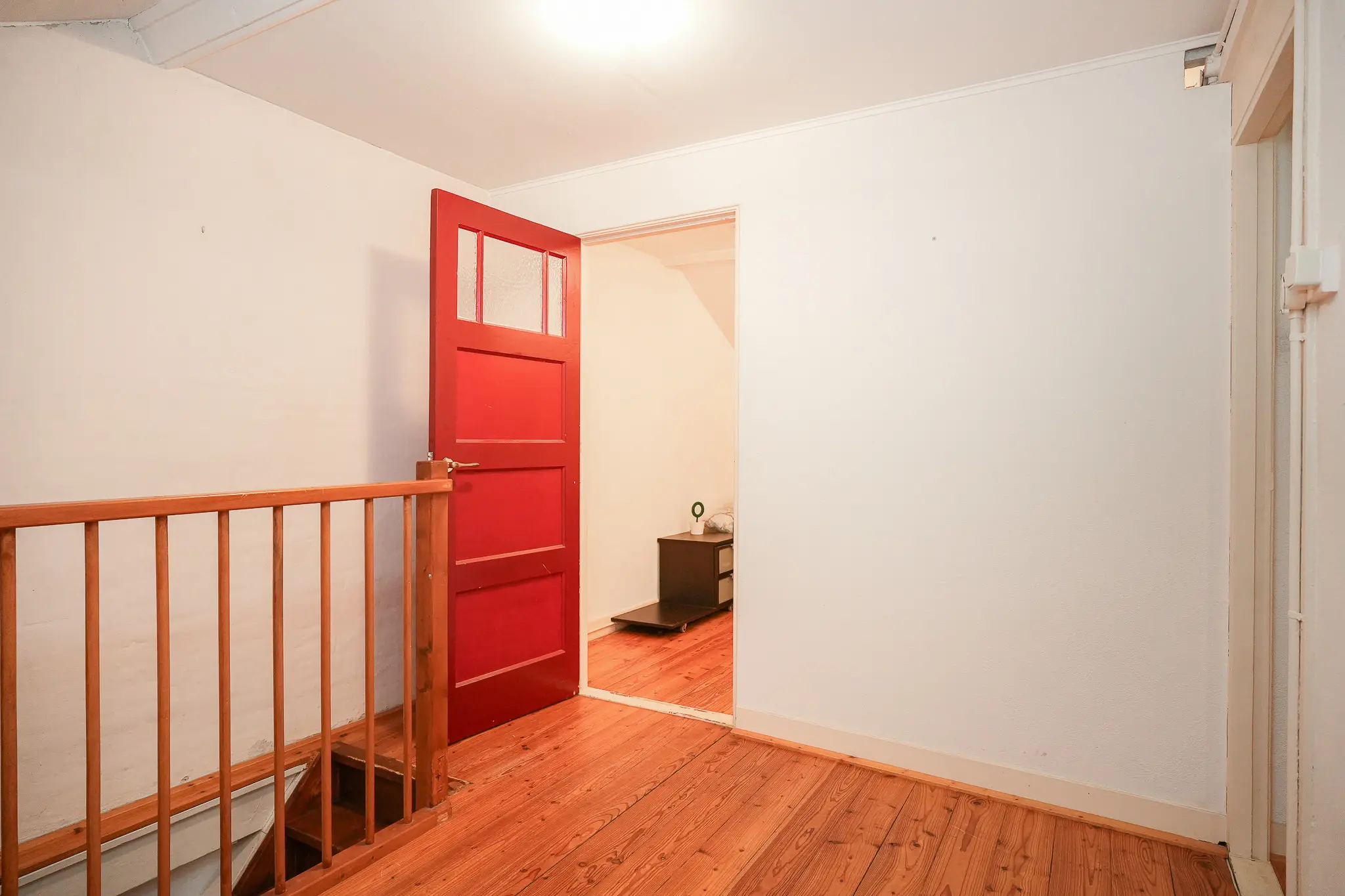 De verdieping is verrassend ruim en volledig ingericht met houten vloerdelen. De overloop biedt een praktische werk- of studeerhoek.