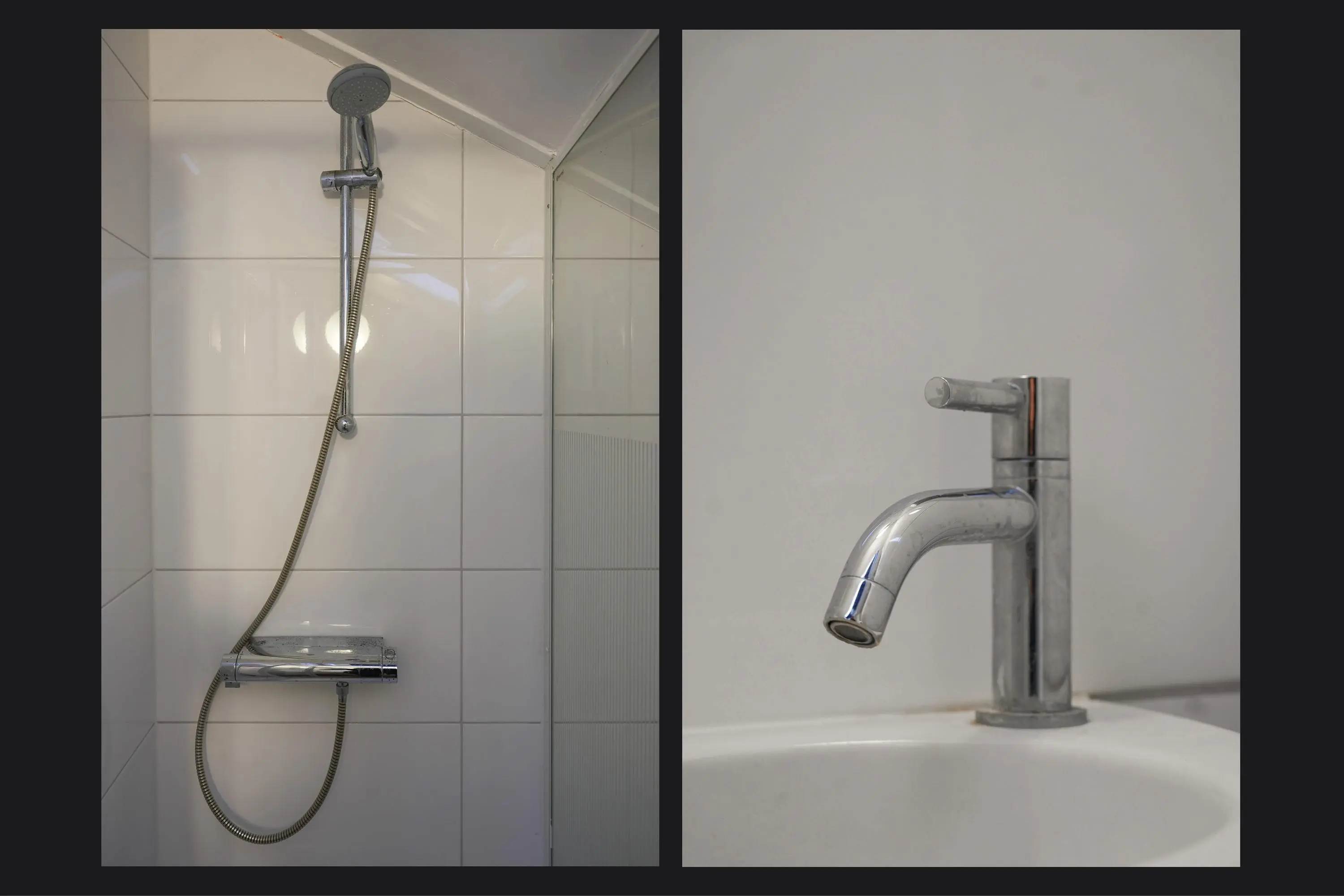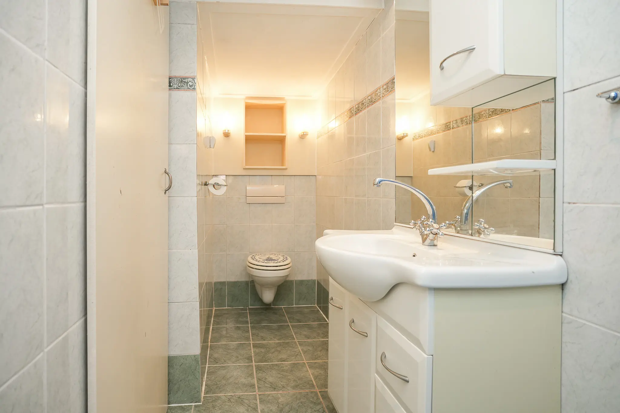 Je komt binnen via de praktische bijkeuken met aansluitingen voor wasmachine en droger en directe toegang tot een inpandige berging. Vanuit de bijkeuken loop je door naar de badkamer op de begane grond, voorzien van douche, toilet en wastafel.