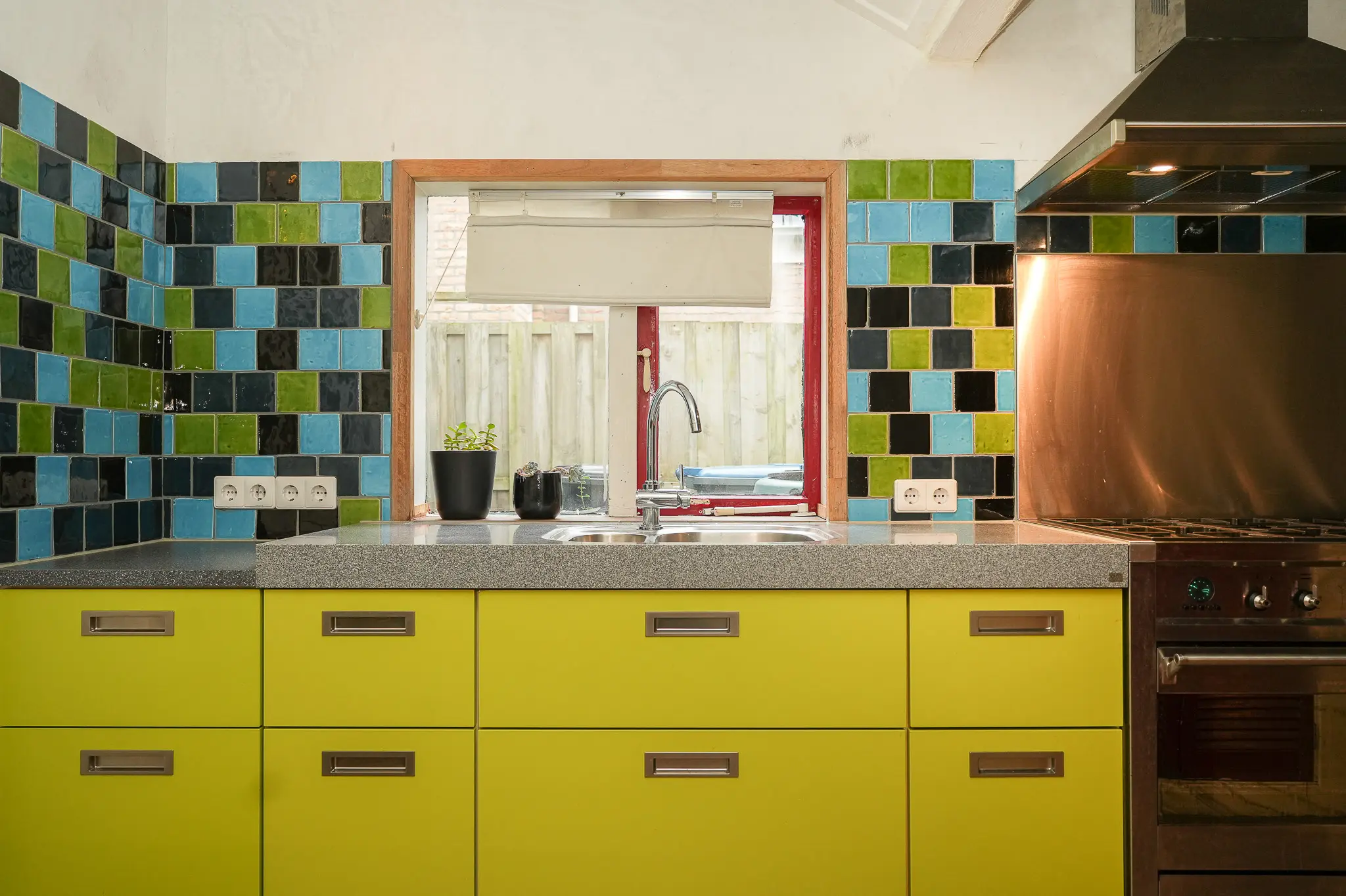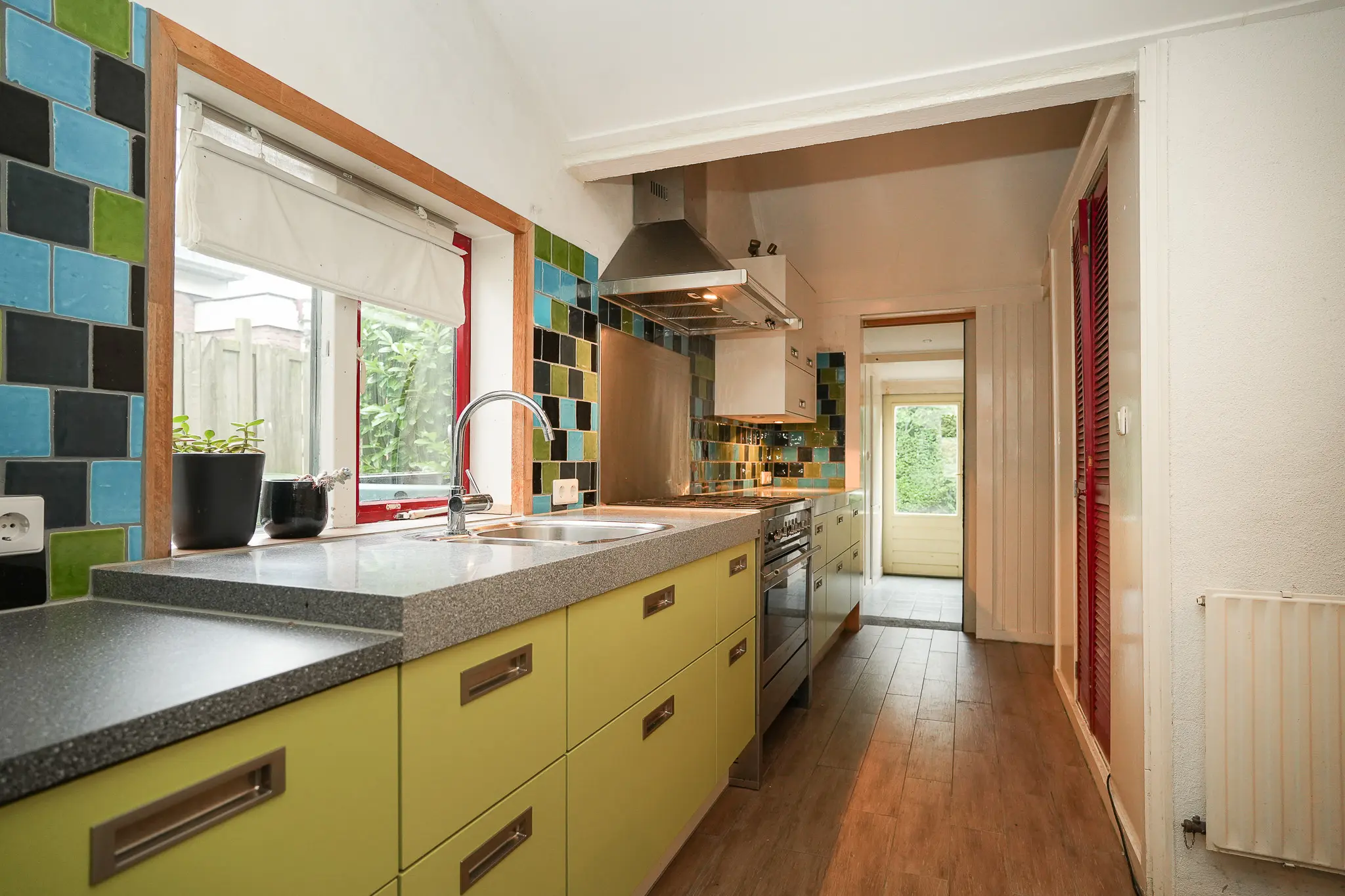 De ruime keuken strekt zich uit over een lengte van circa 7 meter en is uitgerust met onder andere een gasfornuis, afzuigkap en extra opstellingsruimte voor witgoed. Dankzij de lengte en vorm is het een fijne werk- en leefkeuken.