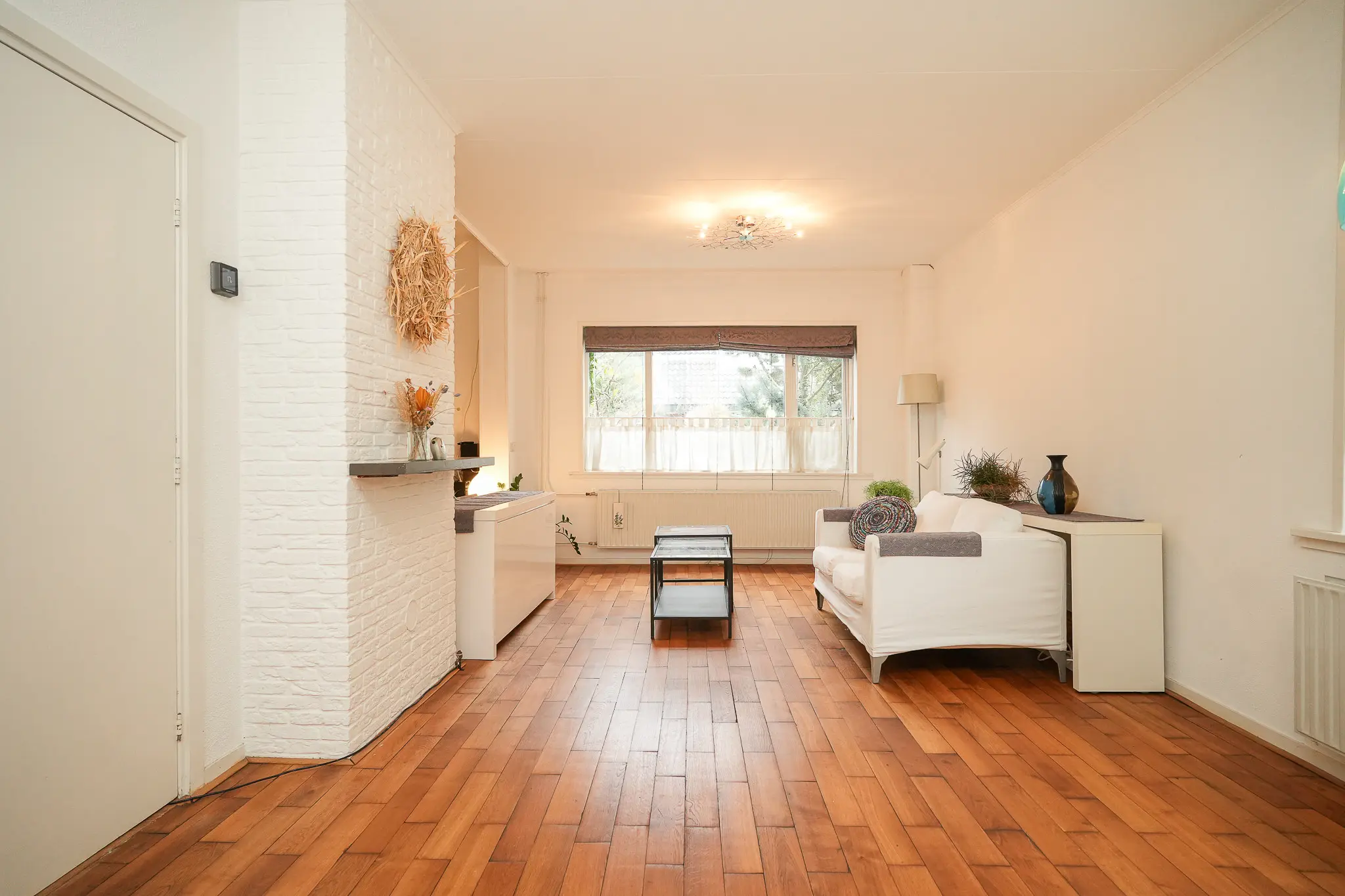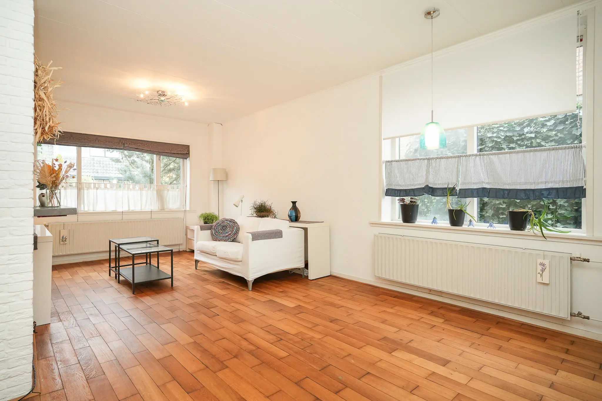 Aan de voorzijde van de woning ligt de sfeervolle woonkamer, afgewerkt met massief eiken vloerdelen en voorzien van karakteristieke elementen zoals de oude bedstee en toegang tot de kelder onder de voormalige bedstede. De ruimte voelt warm en licht door de raampartijen aan de voorzijde.