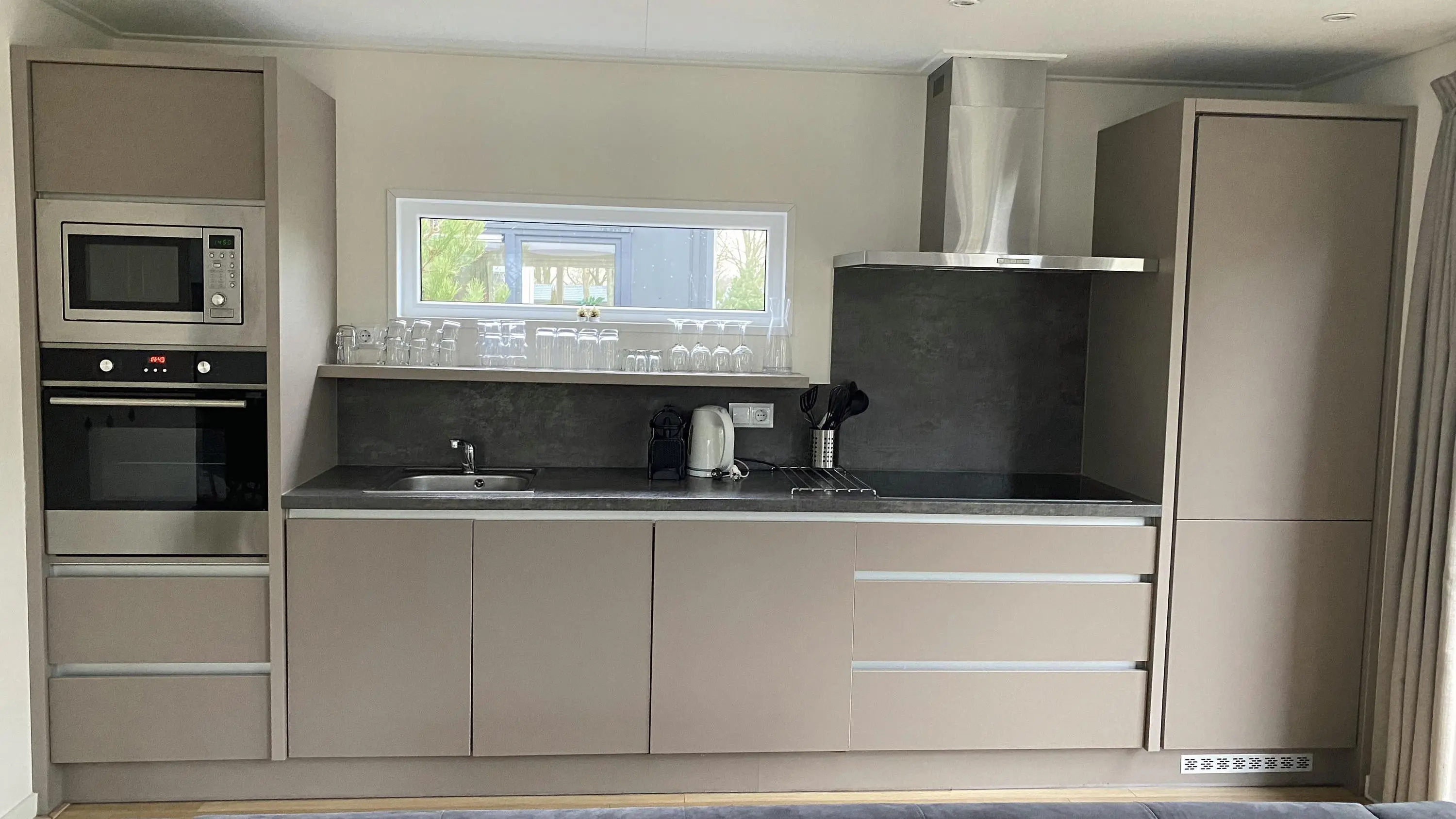 • Complete keuken met koelkast, vaatwasser, oven, magnetron, elektrische kookplaat en koffiezetapparaat — direct klaar voor gebruik.